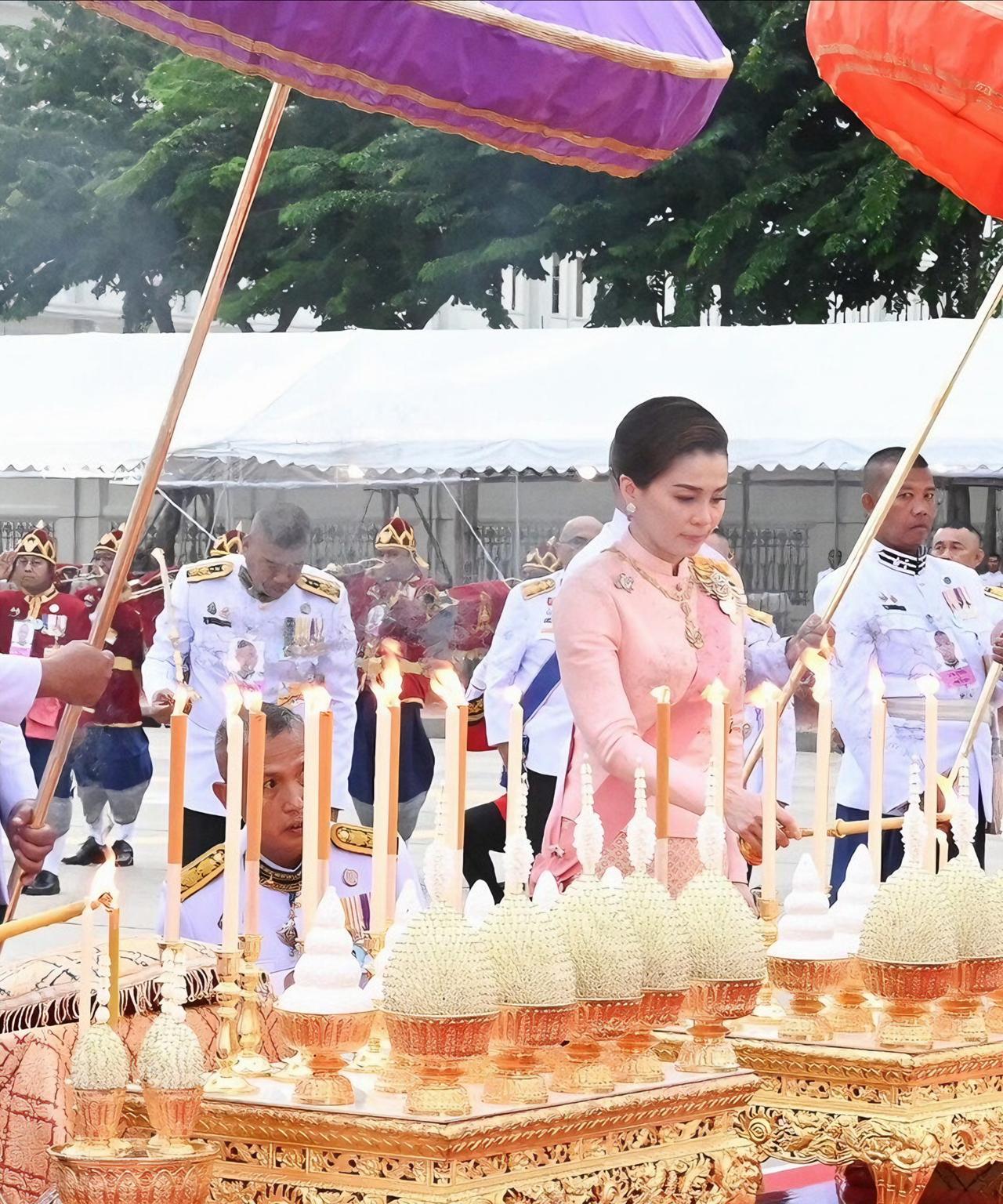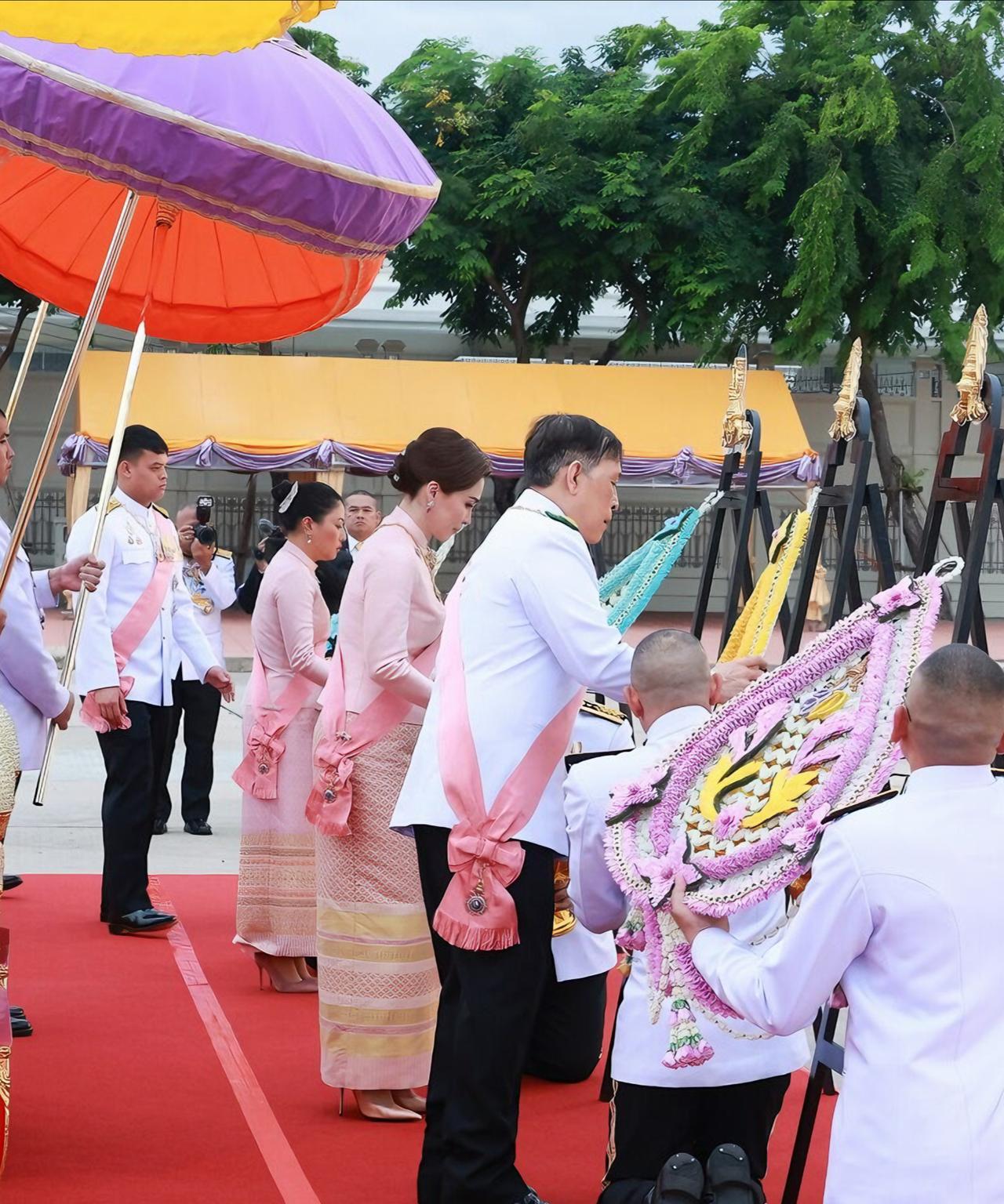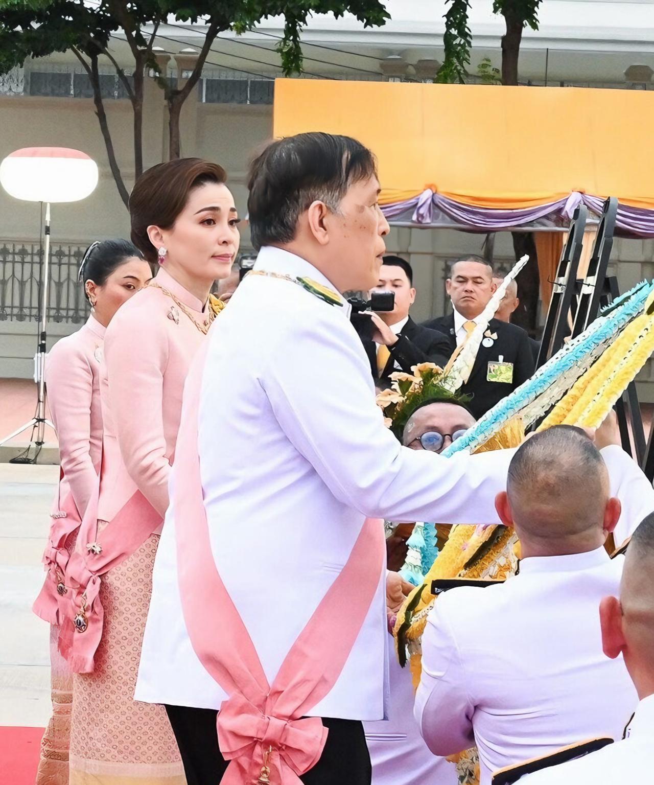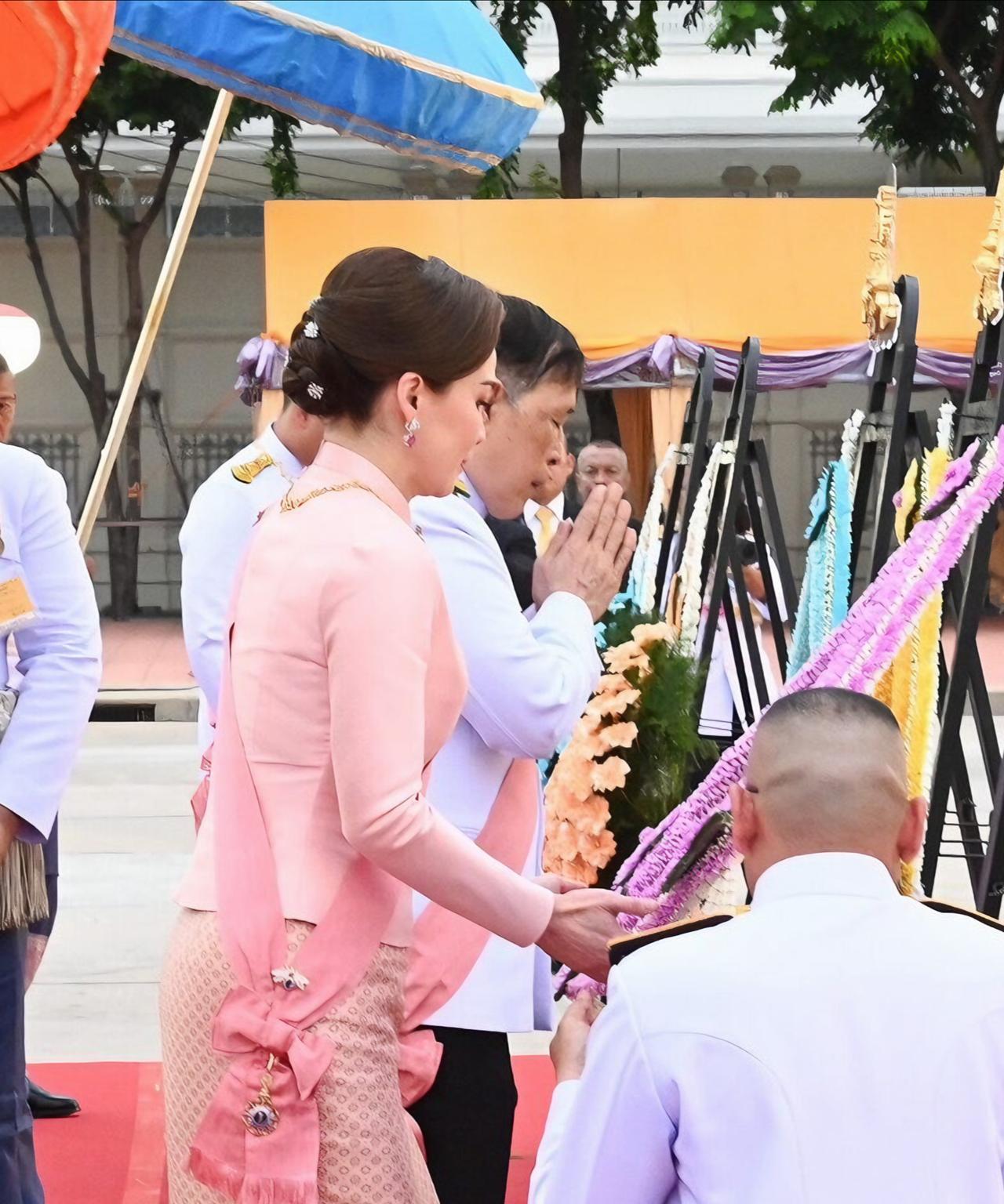苏提达最新造型好美,樱花礼服仙气飘飘 2025年10月23日下午5点21分,国王和王后,乘皇家专车去杜斯特宫,朱拉隆功国王纪念碑敬献花圈,思蕊梵公主与提帮功王子也一同出席。众人抵达后,敬献个人花圈、点燃香烛,并摆上少量供品以表敬意。之后,他们又登上皇家专车,前往大皇宫阿玛琳·威尼猜王座大厅,参加朱拉隆功节皇家功德仪式。