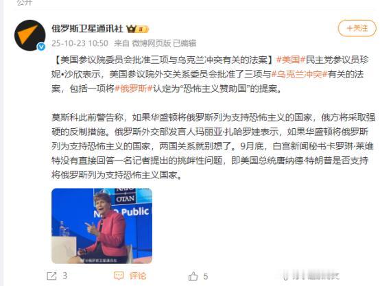 美国将俄罗斯认定为“支持恐怖主义国家”!2025年10月23日(北京时间),美国民主党参议员珍妮•沙欣表示,美国参议院外交关系委员会批准了三项与乌克兰冲突有关的法案,包括一项将俄罗斯认定为“支持恐怖主义国家”的提案。 这一消息在国际社会引发轩然大波,堪称美国对俄战略的又一记“重拳”。不过,这记“重拳”到底是打在俄罗斯身上,还是砸了自己的脚? 首先得搞清楚美国为啥要把俄罗斯扣上“支持恐怖主义”的帽子,按照美国参议院的说法,俄罗斯在乌克兰冲突中“使用了非常规武器”“攻击平民目标”,甚至“资助恐怖组织”。 但这些指控靠谱吗?俄罗斯外交部发言人扎哈罗娃当天就回应了,直接称美国的做法是“粗暴无礼”,说美国只是通过“理论探寻”得出结论,完全是“类推”和“喊口号”,目的就是要在能源、金融领域给俄罗斯致命一击。这话啥意思?说白了,俄罗斯觉得美国就是找借口搞制裁,根本拿不出实锤证据。 那美国这么做,能达到目的吗?看看历史就知道了。 美国之前也用类似的办法对付过伊朗、叙利亚,结果呢?伊朗的石油出口虽然受了影响,但通过黑市交易和与中国、印度的合作,愣是挺了过来。叙利亚更不用说,内战打了十几年,美国的制裁反而让叙利亚和俄罗斯走得更近。 俄罗斯可不是软柿子,这些年被美国制裁惯了,早就有了“免疫力”。扎哈罗娃就说,美国的制裁“不会产生预期效果”,反而会“对全球经济稳定产生负面影响”。 更有意思的是美国这次的法案还可能把自己的盟友拖下水。法案规定,如果其他国家购买俄罗斯的石油、天然气、铀产品,美国就要对这些国家出口到美国的商品征收至少500%的关税。 这招够狠吧?但问题是,印度、土耳其这些国家一直在买俄罗斯的能源,美国真要这么干,等于同时得罪了好几个盟友。印度政府发言人之前就警告过美国,别搞“双标”,还说“确保能源供应是头等大事”。要是美国真把关税加上去,这些国家说不定会联合起来对抗美国,到时候美国可就偷鸡不成蚀把米了。 再看看国际社会的反应,中国外交部虽然还没直接回应这个法案,但一直反对美国的单边制裁和“长臂管辖”。就在10月23日,中国外交部发言人还强调,中国与俄罗斯和伊朗的能源合作是“正常商业行为”,不接受外部干涉。这态度很明确,美国想让中国站队,门都没有。 印度那边更绝,10月23日直接宣布恢复驻阿富汗大使馆,还说要加强与阿富汗的双边关系。这明摆着是在向美国示威,告诉美国,就算你制裁俄罗斯,我该干嘛还干嘛。 欧盟这边更搞笑,10月5日,欧洲议会刚通过决议,认定俄罗斯为“支持恐怖主义国家”,还呼吁欧盟成员国都这么做。 结果到了10月23日,欧盟自己又通过了第19轮对俄制裁,主要针对能源、金融和军工领域。 这速度,简直是“美国一咳嗽,欧盟就感冒”。但欧盟这么积极,真的对自己有好处吗?要知道,欧洲40%的天然气都依赖俄罗斯,制裁俄罗斯的能源产业,最后受苦的还是欧洲老百姓。德国的天然气价格已经涨了300%,老百姓冬天取暖都成问题了,欧盟这不是自己给自己挖坑吗? 最讽刺的是美国国内对这个法案也有分歧,。虽然参议院外交关系委员会批准了,但法案还得经过众议院投票和总统签署才能生效。共和党那边就有人反对,觉得这么干会损害美国与盟友的关系。 更搞笑的是美国自己国内的恐怖主义问题都没解决。就在今年5月,美国参议院还否决了一项打击国内恐怖主义的法案,理由是“担心新法律会为‘不当监视’政治团体打开方便之门”。这不是典型的“只许州官放火,不许百姓点灯”吗? 说了这么多,美国把俄罗斯认定为“支持恐怖主义国家”,表面上看是要孤立俄罗斯,实际上却可能引发一系列连锁反应。美国这招,看似高明,实则是一步臭棋。 就像俄罗斯外交部说的,美国的做法只会“对全球经济稳定产生负面影响”,而俄罗斯“不会对此作出严肃的回应”。为啥?因为俄罗斯知道,美国根本伤不到自己的筋骨,反而会把自己折腾得够呛。 所以美国的政客们还是醒醒吧,别再做“制裁万能”的美梦了。在全球化时代,谁也离不开谁。真要想解决乌克兰危机,还是得坐下来好好谈,靠制裁和扣帽子是解决不了问题的。不然的话,美国早晚得为自己的鲁莽行为付出代价。 来源:俄罗斯卫星通讯社【美国参议院委员会批准三项与乌克兰冲突有关的法案】
