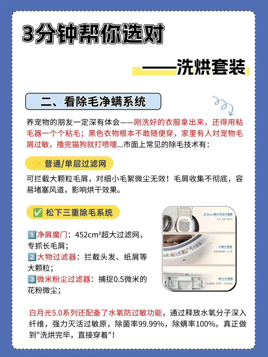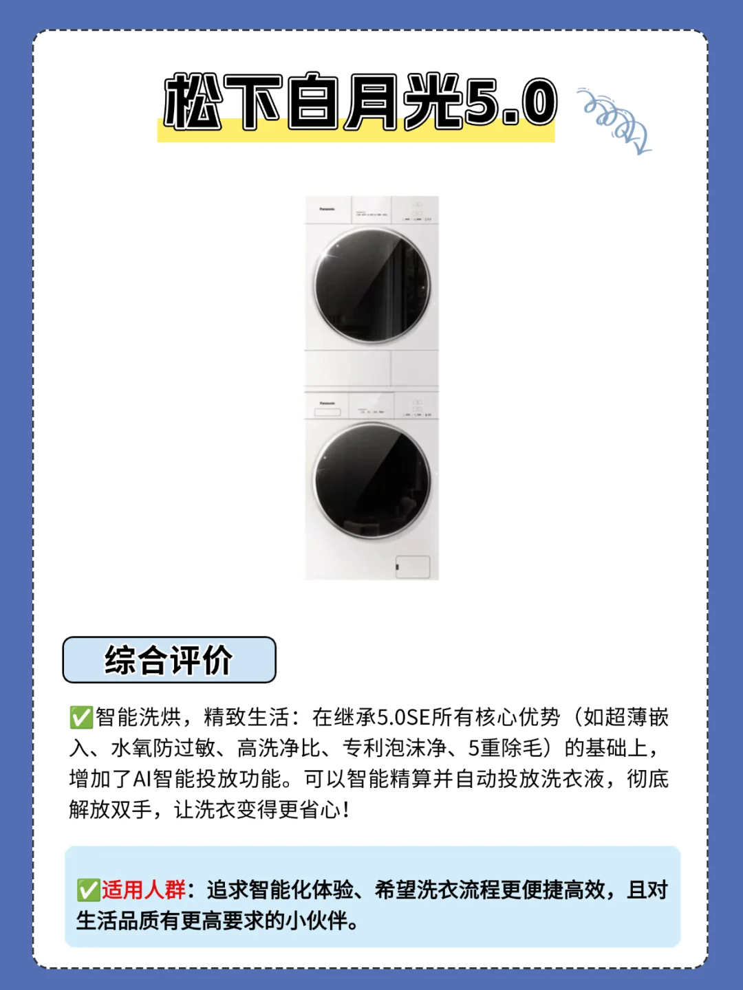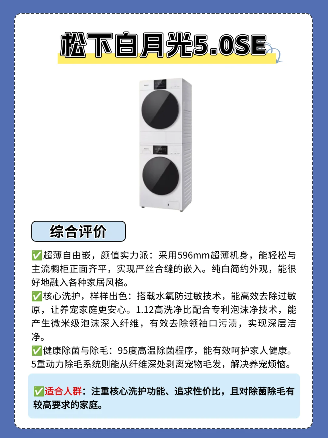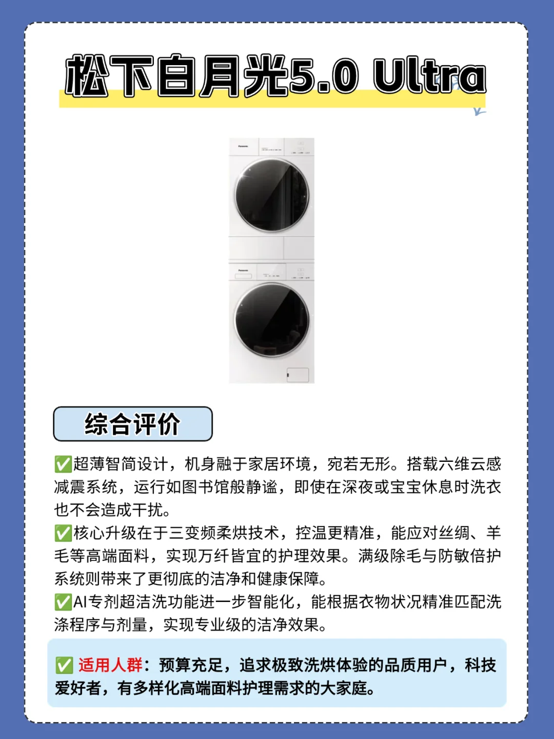 松下白月光5.0 Ultra: 如果你追求极致洗烘护理体验。它集所有顶配科技于一身,提供从除毛、健康到奢宠护理的全能方案,满足你对品质生活的所有想象。