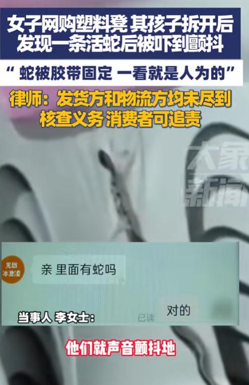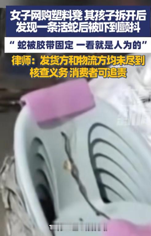 “太缺德了!”10月23日,云南昆明,一女子网购了个塑料凳,孩子们拆快递时竟然发现一条活蛇被固定在凳子上,明显是人为的,两个孩子被吓到浑身颤抖,网友:要是我当场就会被吓晕![ok] 孩子们受到惊吓后,立即打电话向母亲求助,根据李女士的描述,这条蛇整条缠在凳子上面,头和尾都被胶带固定住,这种缠绕方式明显是人为所致。 从现场情况看,蛇被胶带仔细缠绕在凳子表面,而快递外包装并无明显破损,这意味着蛇基本不可能是运输途中意外钻入的,而是被人故意放进去的。 能接触到这份快递的环节,主要包括商家仓库和物流中转站,不论是哪个环节出了问题,将活蛇放入商品包装中,都已超出普通差错的范畴,对收件人构成了严重安全隐患。 当事人表示他们一家都很惧怕蛇类,这次经历给家人都造成了不小的阴影,她联系商家后,对方仅表示对此情况不了解。 类似快递中出现意外“赠品”的情况并不少见,但多数是蟑螂、老鼠等小型害虫,活蛇体积较大,且需要特定方式固定,人为操作的痕迹非常明显。 这种行为不仅有违道德,更涉嫌违法,如果收件人因惊吓引发心脏病或其他意外,责任方将面临法律追责。 应拍照、录像保存证据,及时与商家和平台沟通,若商家处理态度消极,可向市场监管部门或消协投诉。 快递公司是否尽到安检责任也成为关注焦点,活体动物通常禁止邮寄,蛇类还可能涉及野生动物保护法规。 看到这个新闻不少网友纷纷就自己的经历来了一波热聊。 “就在我们昆明发生呢嘛!这种玩笑真呢开不得,娃娃吓出病来咋个整?商家一句‘不清楚’就完事了?包装环节肯定有监控呢嘛,必须查清楚给是哪个整呢!” “看得我手心都出汗了!我家也是两个孩子喜欢抢着拆快递,以后真不敢让他们自己开了,万一咬着孩子,哭都来不及,这放蛇的人心理得多阴暗啊!” “作为从业5年的快递员说句公道话,蛇这种活物我们扫描机过检时会报警,根本不可能混进快递车,大概率是仓库打包的问题,用胶带固定明显是懂行的人干的。” “这已经涉嫌危害公共安全了!如果造成严重后果,还要追究刑事责任,支持当事人报警处理!” “从图片看这是黑眉锦蛇,无毒但性格敏感,用胶带缠住会造成严重应激反应,本身就是虐待动物行为,无论是对人还是对蛇都极不负责!” “去年我买衣服拆出过蟑螂卵,客服赔了50元优惠券了事,现在看这情况,建议平台强制要求商家仓库安装监控,否则以后谁还敢网购大件物品?” “两个孩子可能会出现创伤后应激障碍,建议家长带孩子做心理疏导,表现为持续做噩梦、害怕拆快递等,需要专业干预。” “想起我们寨子老人说的“蛇入宅莫伤害”,但这是直接把蛇当恶作剧道具,传统美德都让这些人败坏了!” 如果您遇到这种情况,会选择报警还是接受平台赔偿?说说您的理由?或者您觉得对恶作剧者最解气的处理方式是什么?欢迎在评论区支招! 信息来源:大象新闻