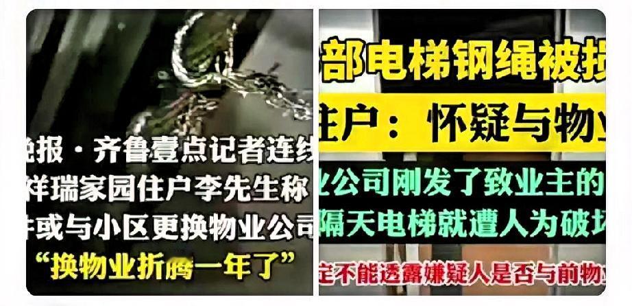 呼和浩特,割坏电梯揽胜的两人,找到了,两人的身份不一般,据小区人员透露,不是小区业主,疑似是前物业公司人员,据说是毁坏的32部电梯是24层的,因为物业公司之间有纠纷,与换物业有关。 据了解,这起案件发生在呼和浩特市赛罕区金色阳光小区,损坏的是该小区的32部电梯,事发当天正值新老物业公司交接,二人故意割坏电梯以示报复。 32部受损电梯中主要是24层的,23部受损电梯的钢绳被切割,致使电梯轿厢在正常运行情况下发生坠落,所幸的是电梯检修人员在前一天对这23部电梯进行了检查和保养,对电梯进行了加长安全制动器的安装,延长了电梯的制动安全距离,这才避免了事故的发生。 损坏的电梯需要重新更换钢绳,费用昂贵,还需要等厂家的钢绳加工出来安装到位才能使用,期间影响业主出行,尤其是老年人乘坐电梯出行不便。 这种故意损坏公用设施,情节严重,危害公共安全的行为,必将受到法律的严惩。 麻烦看官老爷们右上角点击一下“关注”,既方便您进行讨论和分享,又能给您带来不一样的参与感,感谢您的支持!