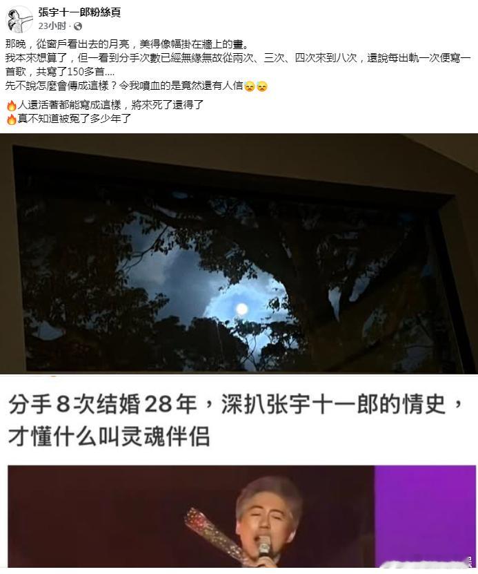 张宇辟谣出轨8次张宇 真不知道被冤了多少年据台媒,有自媒体发文称歌手张宇和妻子十一郎 “结婚28年、出轨8次”,还说 “每逢婚变就写一首歌”。23日,两人在社交平台上转发否认传闻:“人还活着都能写成这样,将来死了还得了,真不知道被冤了多少年。”