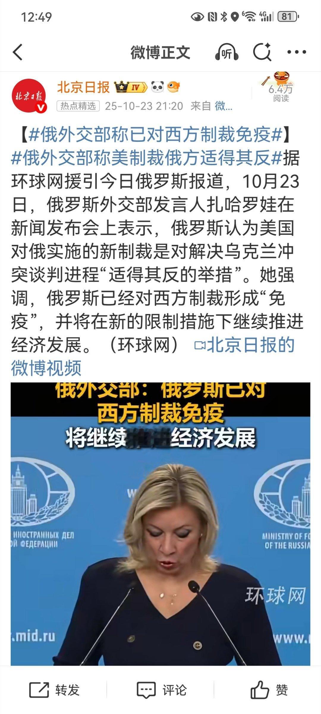 【俄外交部称已对西方制裁免疫】俄外交部称美制裁俄方适得其反俄乌战争打了快4年,缺打出了很多令人不可匪夷所思的现象。比如这场战争对于俄罗斯而言是“越打越有钱”,给了俄罗斯继续选择战争以莫大的勇气;再比如“俄罗斯对西方制裁免疫”甚至“美制裁俄方适得其反”,俄罗斯应该欢迎美西方加大对俄罗斯的制裁力度,那样美西方就会一天一天地“烂下去”,俄罗斯反而会一天一天地“好起来”。