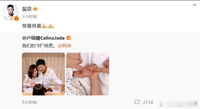 吴京祝贺韩庚卢靖姗二胎出生吴京恭喜韩庚卢靖姗二胎出生吴京恭喜韩庚、卢靖姗二胎出