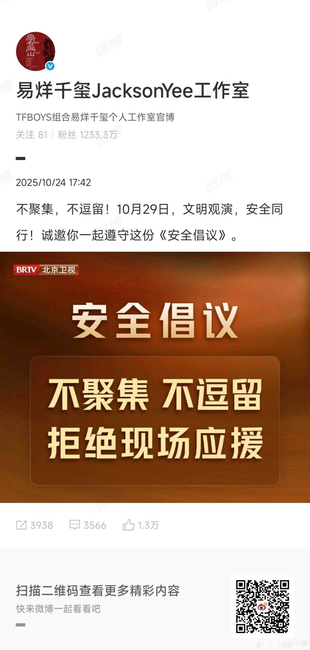 易烊千玺工作室文明观演倡议响应安全倡议,共赴精彩之约!10月29日,跟着易烊千玺工作室的文明观演倡议,安全同行更安心~