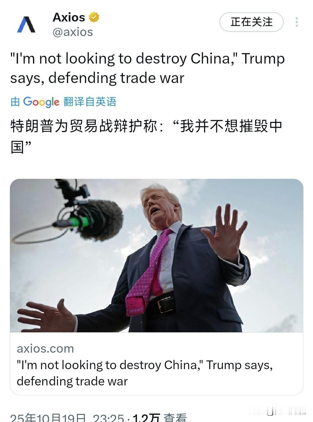特朗普称不想搞垮中国,关税却涨到157%,两周后韩约会是真谈判吗? 北京时间10月19日晚,美国前总统特朗普接受采访时说“不想摧毁中国”,但提到自己当政时对中国加征了三千多亿美元关税,现在税率已经飙到155%到157%。他说中方愿意谈,计划两周后去韩国见面。 特朗普团队总爱拿关税说事,可美国消费者这些年物价涨了不少,不少工厂也搬回国又搬走。之前打贸易战,美国农民和企业叫苦不迭,现在他又要谈,到底是真想解决问题,还是又在玩选举套路? 有报道说特朗普过去的关税政策反而害了自家经济,这次约中方见面可能是新动作。但这么多年谈了又崩,最后总是没下文。这周的事,下周开会能不能谈拢还不好说,反正大家就盯着吧。