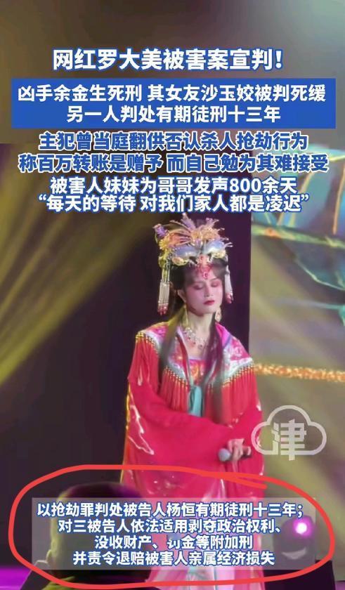 罗大美案一审宣判!主犯死刑、从犯死缓,这哪是判案,分明是给“熟人作案”钉了块警示牌! 诱骗的那个叫杨恒是最应该判死刑,如果没有他诱骗,大美也不会死,所以说他是最可恶的!像这么恶劣的杀人,应该所有参与者全部判死刑,否则以后会有许多人再作案! 死刑判缓刑意味着她有机会活着,我都能想到最后由于此人表现良好,改为20年,有立功表现,再过10几年出狱,以后成为杀人帮凶都不用死了,因为我们是有包容度有爱的国家! 共同参与策划绑架杀人,竟然还能缓期二年执行,对罪犯的仁慈,自己不努力而通过谋害别人不劳而获,应当几个人立即死刑!社会影响极其恶劣!