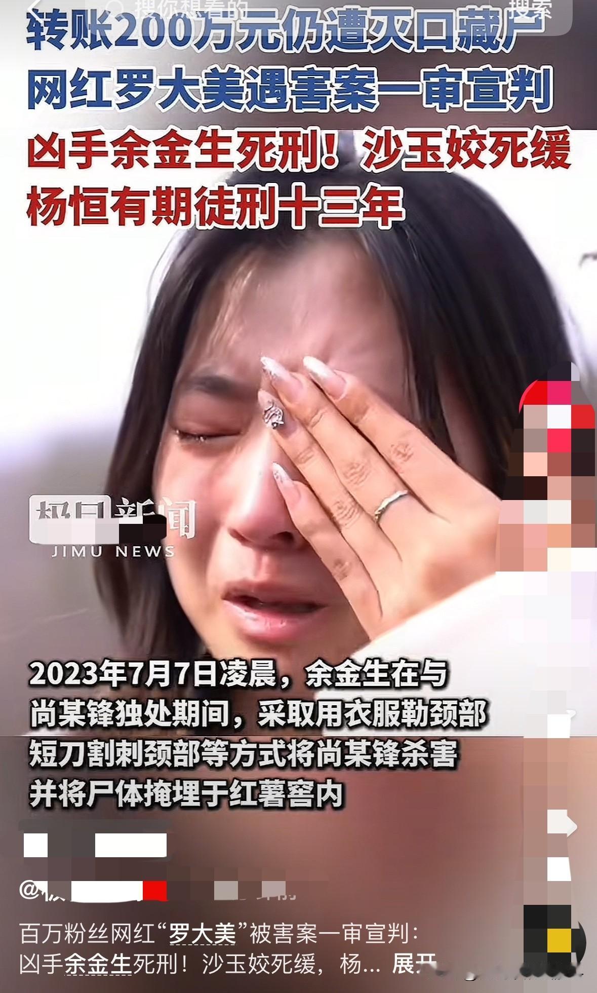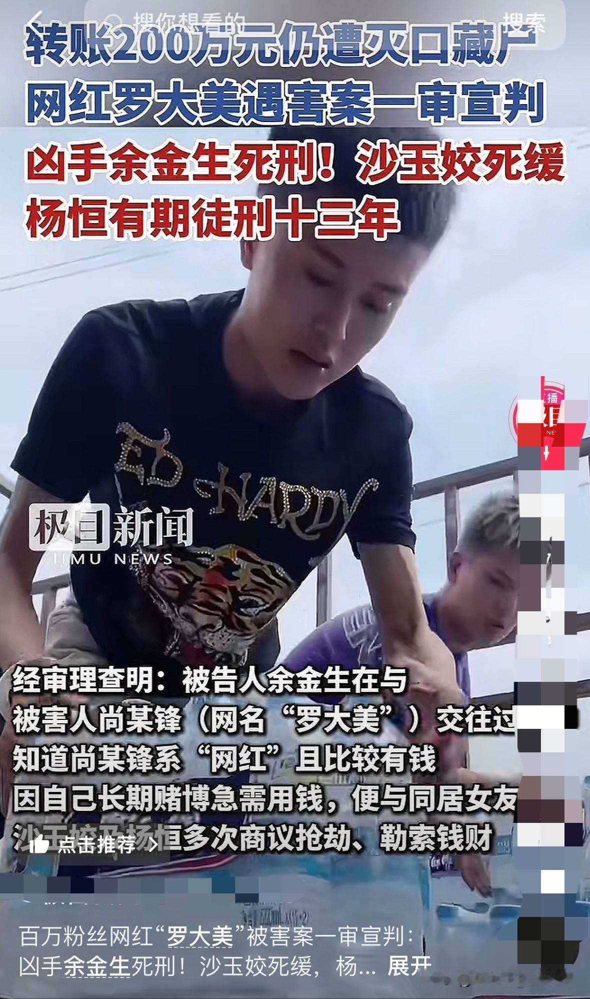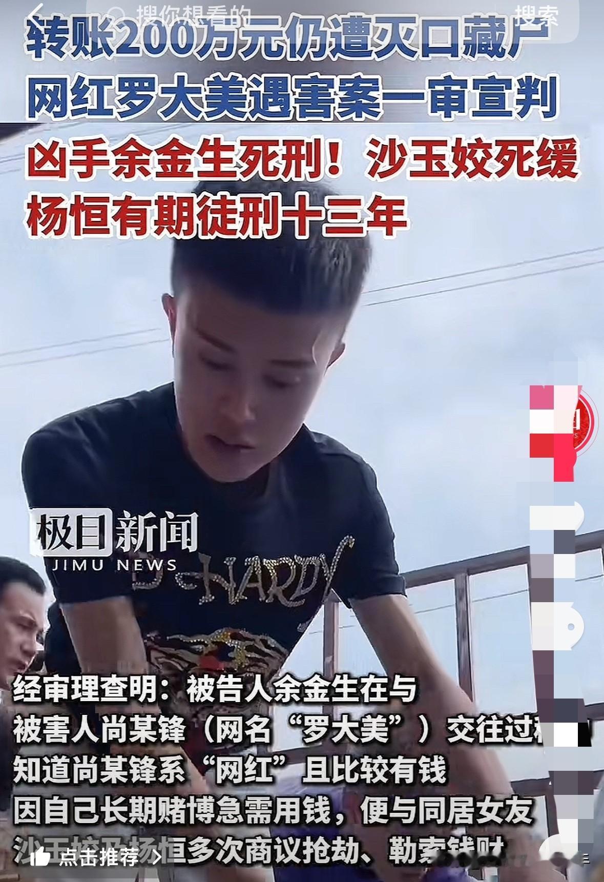 罗大美案宣判, 最让人意难平的根本不是死刑判决, 而是杨恒那13年刑期,这哪是罚,简直是给“致命诱饵”开了特例! 余金生赌博缺钱,拉着沙玉娇和杨恒预谋抢劫。没有杨恒用微信把罗大美诱骗到出租屋,后面绑人、转走200多万、埋红薯窖的惨剧根本没起点。 家属要抗诉太能理解了,检察院都认定三人不分主从,法院却让他不担退赃、不担命案责任。 三个凶手一个偿命两个坐牢,看着是尘埃落定,实则藏着最狠的教训:那些“时有交集”的熟人,一旦惦记你的钱,比陌生人更致命,因为他们知道怎么骗你入局。 这案子哪是结束,是给所有人敲警钟。你们说,熟人的邀约,到底怎么分辨是善意还是陷阱?