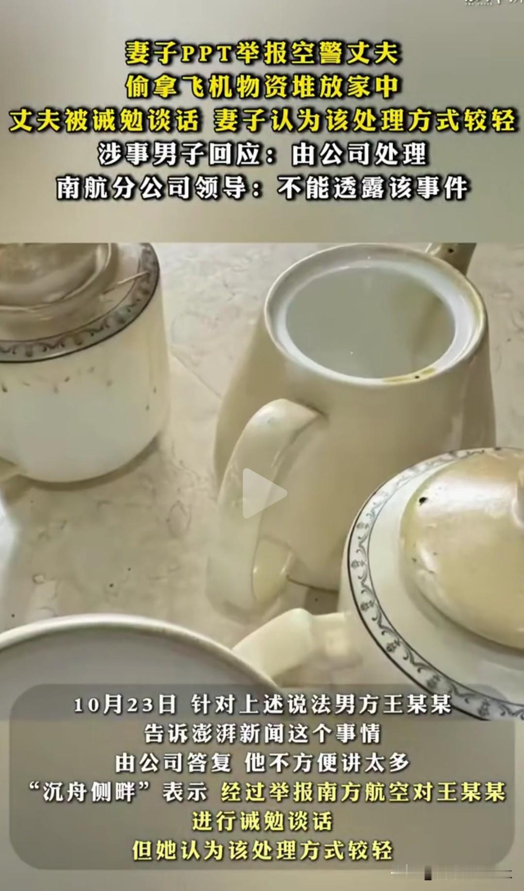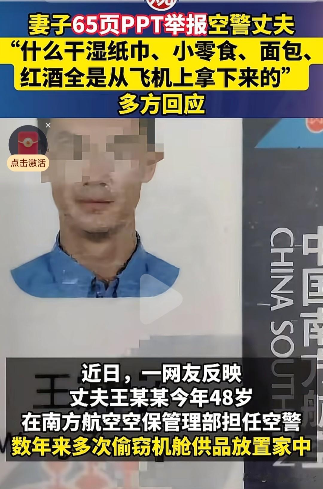 一名妻子精心准备65页PPT实名举报空警丈夫,不是出轨,不是家暴,竟是一个丈夫小癖好,一心就想把丈夫送进去。 近日,一网友实名举报在南航担任空警的48岁丈夫王某某,精心制作了65页PPT,大家都以为蕴藏大瓜,不是出轨,就是家暴,然而却是丈夫多年来多次由机舱偷窃的物质,看到这些东西也是惊呆众人。 水杯,毛巾,水壶,刀叉,干湿纸机等日常用品。 真服了女子,为了这些东西竟制作了65页PPT,从这些东西看,有的水壶生锈了,杯子也水渍,都有可能是淘汰下来的,甚至有瓶红酒只有半瓶。 她说,丈夫说不拿白不拿。这是实在找不出问题,太牵强。 去年3月份举报一次,事隔一年,南航收回物品,对王某某进行诫勉谈话,但女子认为处理得太轻,接着举报。 占便宜是不对,但也不是十恶不赦,不知道这女人咋这么恨丈夫,一心想将丈夫送进去,按说丈夫还是挺勤俭持家的,不出轨,不家暴,还有啥让她如此耿耿于怀? 这可能就是别人说的同床异梦吧,你想着过日子,她想着如何分手,如何拆家,甚至还想将你送进去,这样的枕边人想想都可怕。 两人有共同的孩子,都是孩子最亲的人,不要将事做绝,好聚好散是最明智的做法。