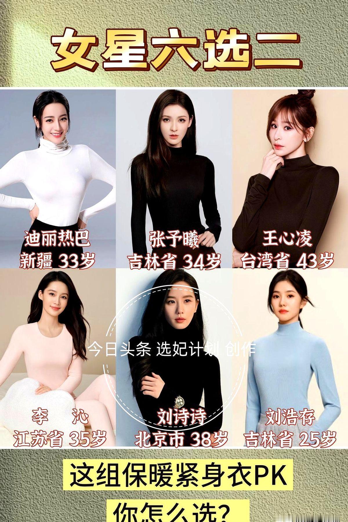 如果这六位女星同穿紧身衣在你面前,你选谁? 摆出这么个阵仗,从流量女王到甜心教主,确实让人得好好掂量一番。 这边迪丽热巴以33岁的巅峰状态领衔,那边王心凌带着80后的情怀唱跳,更有谋女郎刘浩存和顶着“思聪哥严选”名头的张予曦,各自展现着不同的魅力。 但我还是把目光投向了刘诗诗,她不需要用紧身衣来刻意勾勒,那种由内而外散发出的气韵,就是对“美神下凡”最直接的演绎。 所以我坚定地选择刘诗诗和刘浩存,这种清冷疏离的美感,才是我一直欣赏的审美标准。
