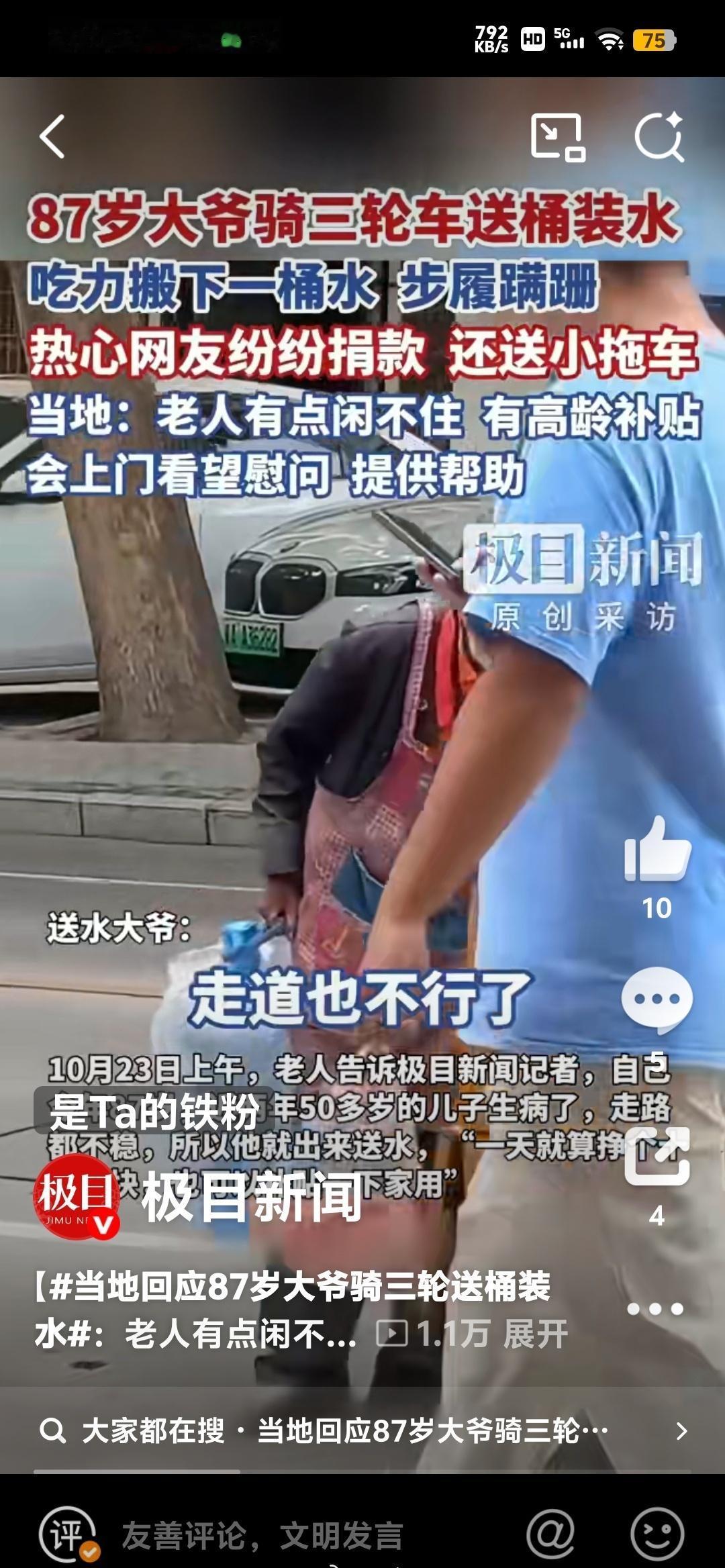 87岁的聂大爷佝偻着脊背,从三轮车上颤巍巍搬下桶装水的身影,戳中了无数人的心。本该安享晚年的年纪,只因50多岁的儿子患病失去劳动能力,他便毅然扛起家庭重担,用"一天挣十块八块也能补贴家用"的朴素坚持,书写着父爱的重量与生命的韧性[__LINK_ICON]。这份在生活重压下不肯低头的"倔强",远比任何豪言壮语更令人动容。 网友的反应则让我们看见善意的模样。有人急着要联系方式愿每月捐助,有人细心下单小拖车减轻老人负担,博主则成了爱心桥梁,将捐款换成现金转交、代为接收物资。没有轰轰烈烈的口号,只有"怕他摔倒"的真心牵挂和实实在在的援手,这股涌动的暖流,让冰冷的生活多了温度。 但感动之外更需深思:当高龄补贴已发放、不符合低保条件,老人仍要靠送水贴补家用,背后是特殊家庭的现实困境。网友的爱心能解燃眉之急,却难以覆盖所有类似的"聂大爷"。如何让政策帮扶更精准地触达这类边缘群体,如何让数字化时代的善意跨越"老年机"的障碍,才是这则新闻留给我们的长远命题。 从老人布满老茧的手,到网友跨越屏幕的援手,这场双向的感动证明:生活或许沉重,但担当与善意永远能照亮前行的路。愿每一份不屈的坚守都能被温柔接住,每一次爱心涌动都能推动更坚实的保障。