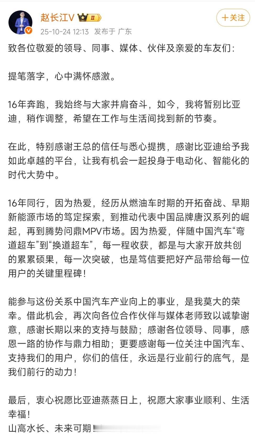 在比亚迪16年,这位大将辞职了。