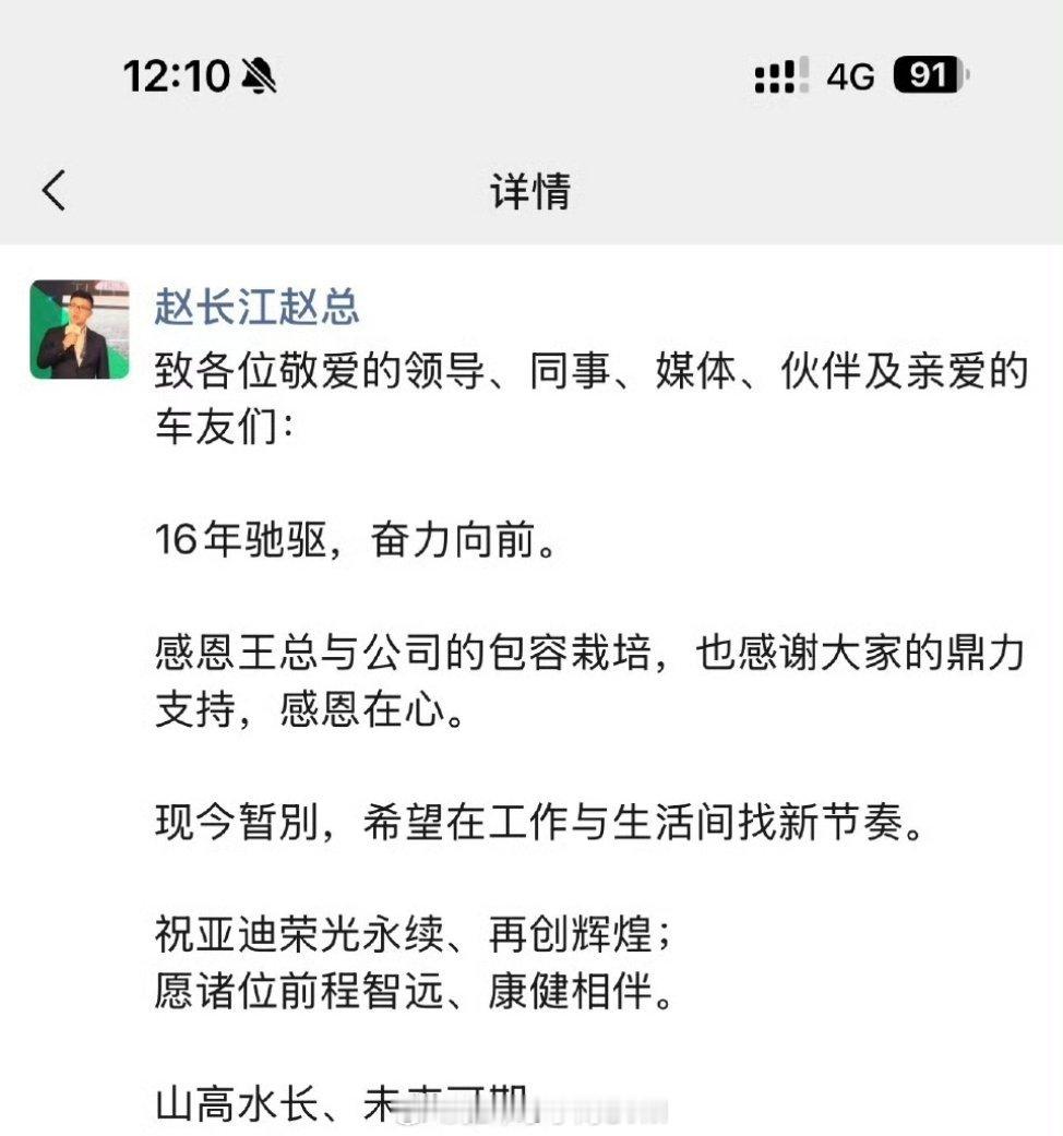 比亚迪赵长江辞职