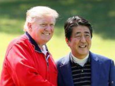 图:已故前日本首相安倍晋三(右)2019年5月接待来访的美国总统特朗普(左),在高尔夫球场挥杆。 (法新社档案照)