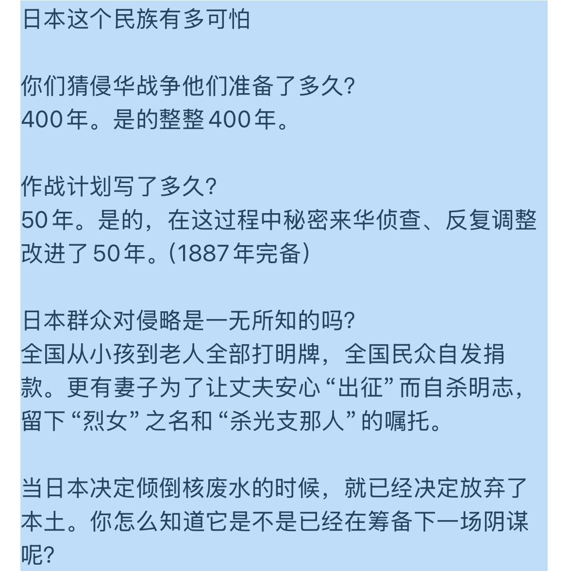 历史早有预警:16世纪丰臣秀吉就制定了侵朝侵华计划,妄图天皇迁北京、自己坐镇宁波,野心昭然若揭。日本侵略野心 近代侵略不是临时起意:日本秘密来华侦查50年,1887年就拿出完备作战计划,步步为营的谋划值得警惕。 曾有全民被裹挟的教训:过去日本社会被战争狂热影响,民众自发捐款支持侵略,这样的历史必须铭记。 当下更要保持清醒:日本不顾反对倾倒核废水,只算自身成本的短视做法,需以史为鉴、警惕风险。