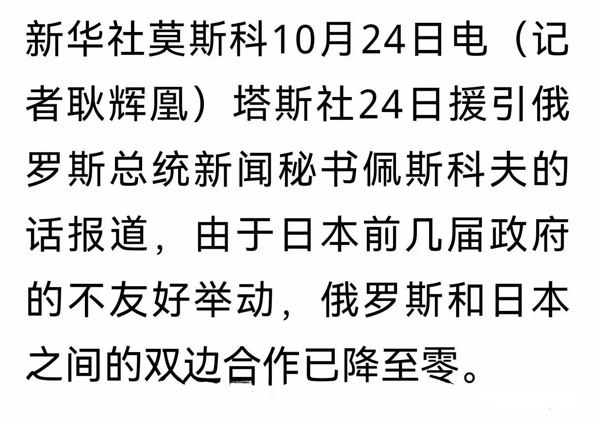 俄罗斯总统新闻秘书佩斯科夫在关键节骨眼上专门向日本喊出这番话,高市早苗估计要唱凉凉。 近日,佩斯科夫表示:由于日本前几届政府的不友好举动,俄罗斯和日本之间的双边合作已降至零。 佩斯科夫的这番表态可谓一点没留情面,完全没顾及本想上任首相后与俄罗斯缓和关系的高市感受,不单没发贺信,更是直接给高市挖了个“零”的冷窟窿。 实话说,感觉佩斯科夫的这番话挺解气的,不知道友友们什么感受,欢迎在评论区分享交流。