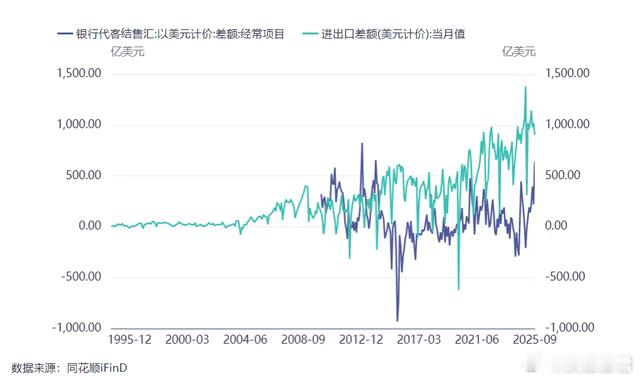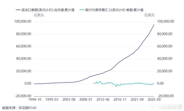 这些年累计起来的话,结售汇的差额几乎为0,而进出口顺差接近10万亿美元。