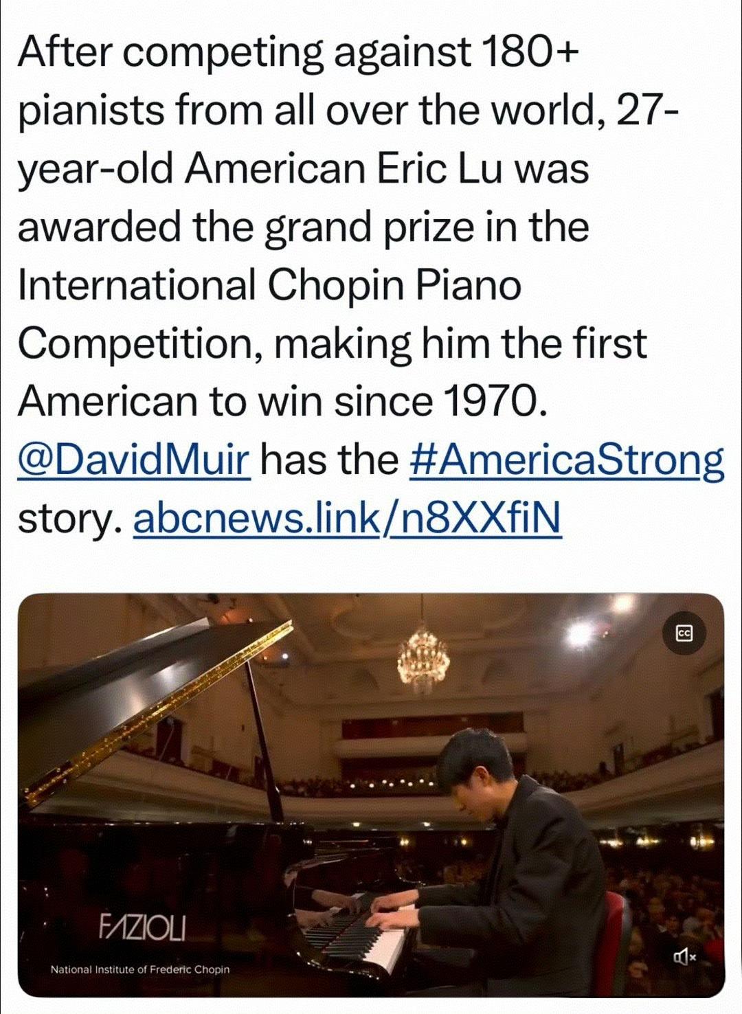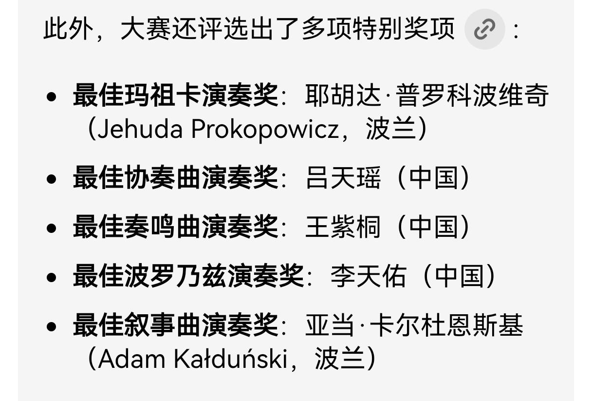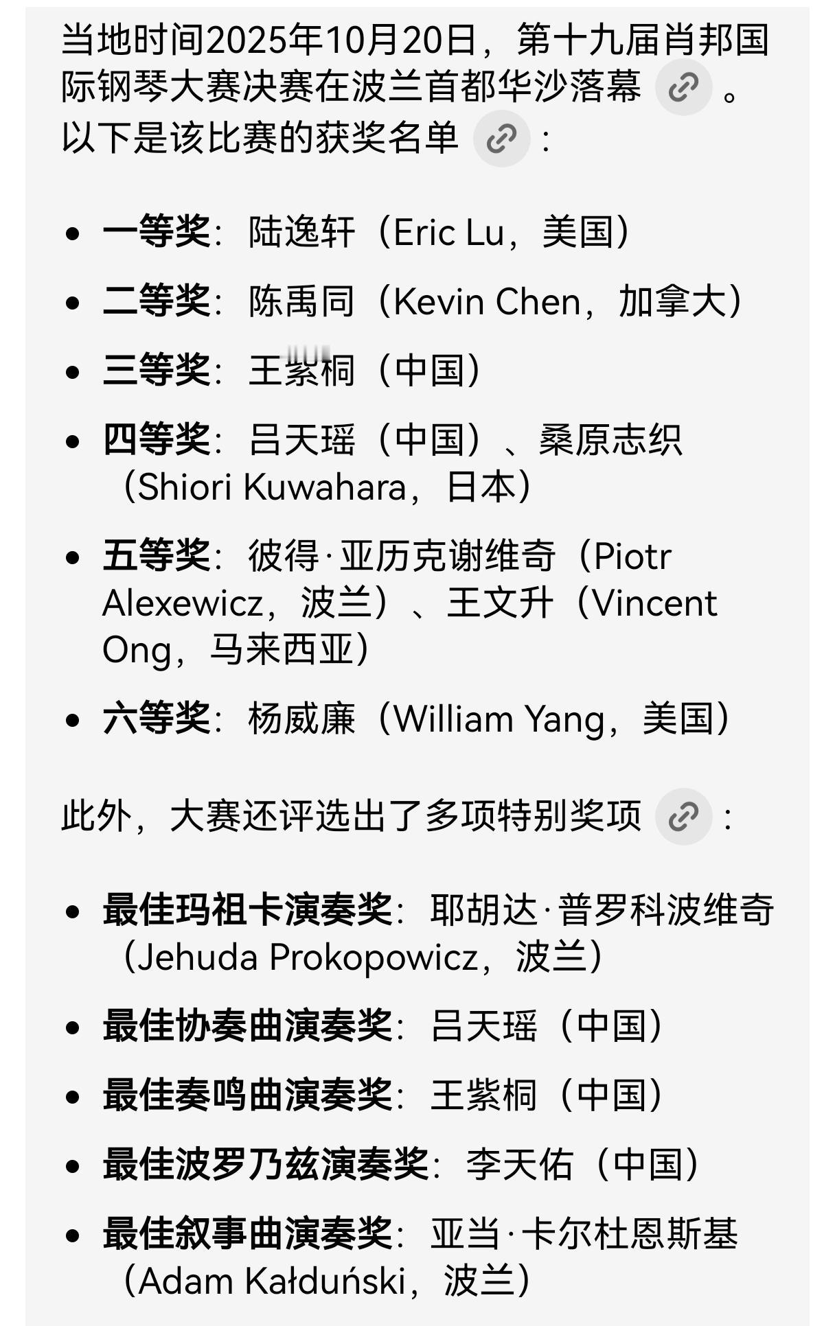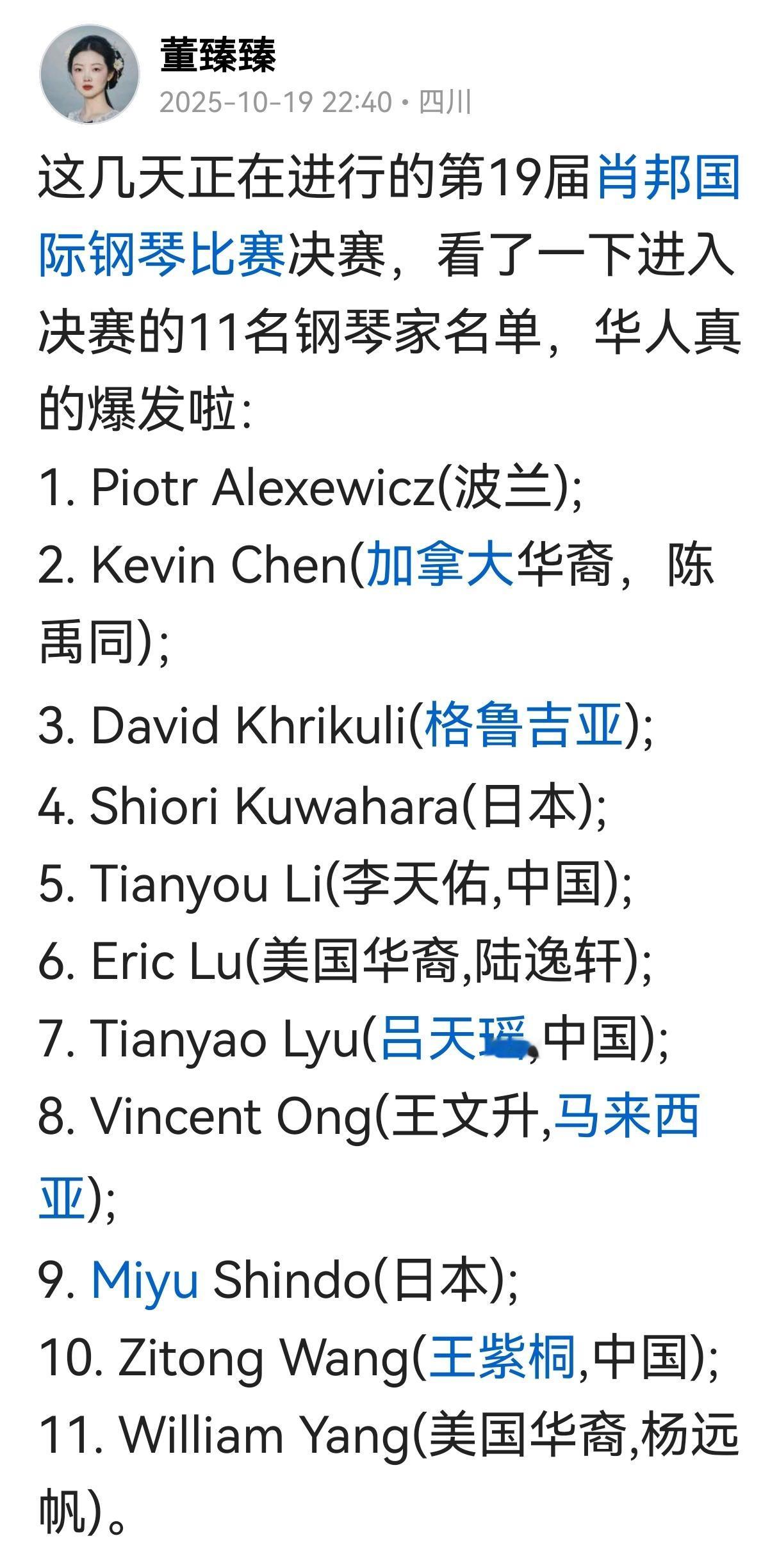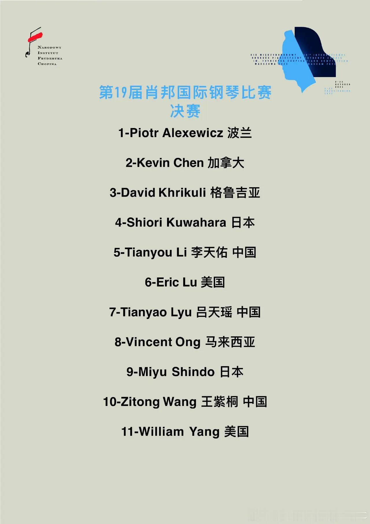 第十九届肖邦国际钢琴大赛最终答案已于2025年10月21日揭晓,美籍华人陆逸轩凭借着清晰、敏锐、情感深邃的演奏风格,获得冠军奖杯。来自中国的王紫桐、吕天瑶获得第三名和第四名,也是不错的。第二名是加拿大籍华人陈禹同。这次的特别奖几乎被中国钢琴家们包揽,也是不错的。