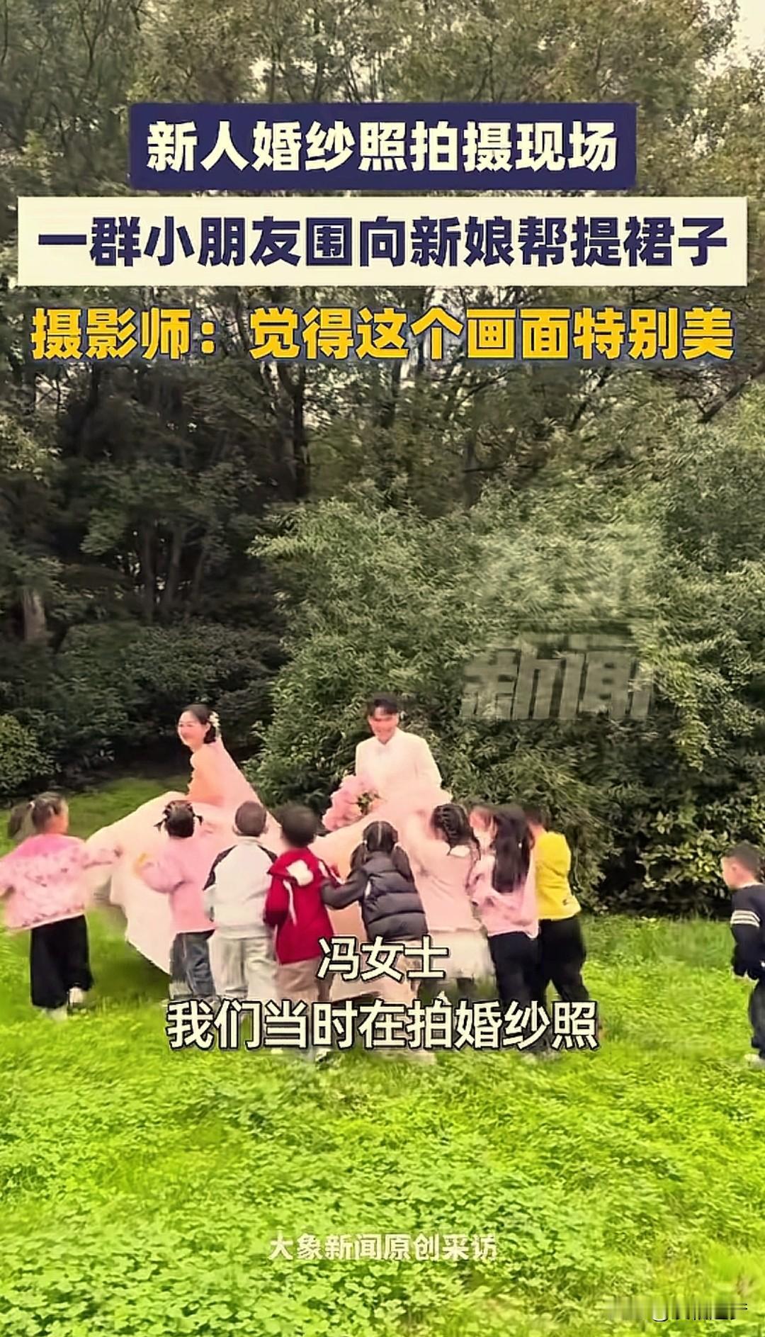 “太有福分了!”陕西西安,一对新人在草地拍婚纱照,新郎刚为新娘提起裙角准备前行,忽然跑过来一群小朋友,抢了新郎的位置,共同提起婚纱将新娘送入草坪中。新娘回头无意中数了一下人数,心里突然一暖!网友:这场景比婚纱照还美! 根据大象新闻10月24日报道,这件令人羡慕的事,就发生在户外婚纱摄影的一处草坪上。 视频里,新娘穿着淡粉色的长裙摆的婚纱,如同公主一般,她和新郎刚打算提起裙摆找机位拍摄照片,一群热心的孩子突然冲了过来,叽叽喳喳围住了她,不约而同的提起裙摆,将她“送”到了草地中 心才轻轻放下。 女孩子们停下来时,更是羡慕得舍不得放下,也许在她们眼中,新娘的打扮就是她们心中公主的形象。 而新娘也乐的合不拢嘴,她看着前来帮忙的孩子们仔细查了一遍,竟然正好是10个!结婚拍照本来就是喜事,这下又赶上了“十全十美”,新郎新娘乐的合不拢嘴,赶忙让摄影师记录下这段视频,并发到了网上。 有网友羡慕:太有意义了!这对新人太幸运了,这不就是现实版的“多子多福吗?” 也有人说:这个镜头就很美好!这段一定放到原片里,小孩子没那么复杂情感,全是对新娘的喜欢和真挚爱! 这真是一件“意外之喜”,这事儿妙就妙在它的“不请自来”。 现在很多婚纱照拍的特别漂亮,但总是给人一种“固定化模式”,少了点自然美,这群小朋友一冲过来,整个画面立马就“活”了 。 这样的场景实在是难得一见,这对新人真是运气爆棚了,希望往后的日子都能像这天一样,充满十全十美的福气!