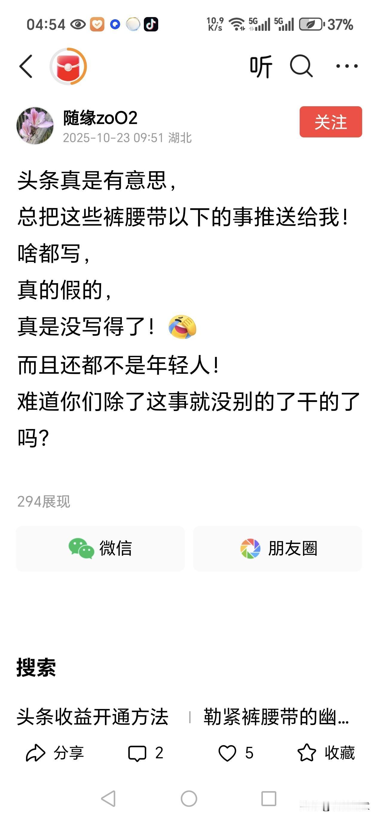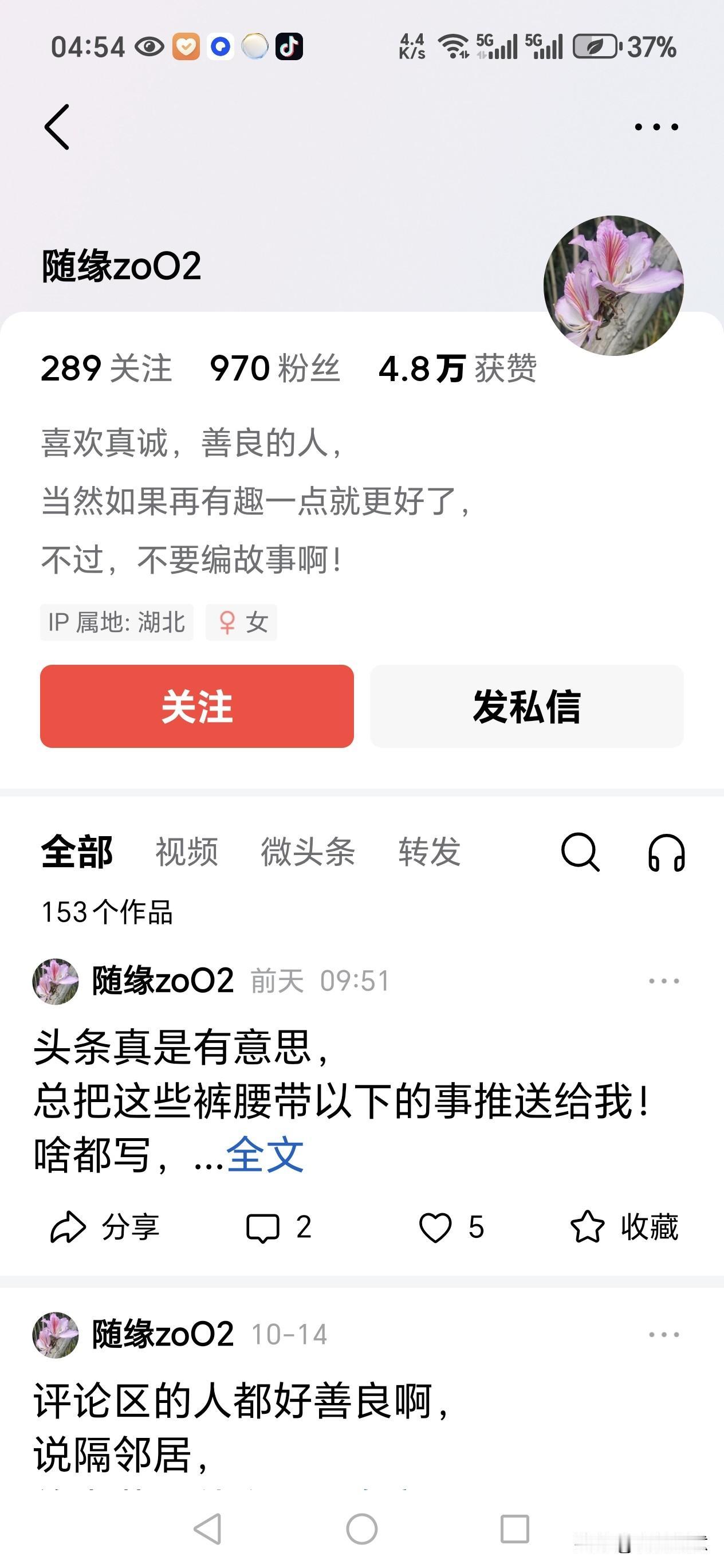 这位来自湖北的女条友@随缘zoO2 还真有意思[捂脸],自称“喜欢真诚、善良的人,当然如果再有趣一点就更好了,不过,不要编故事”,居然发微头条说“头条真是有意思, 总把这些裤腰带以下的事推送给我! 啥都写, 真的假的, 真是没写得了![捂脸] 而且还都不是年轻人! 难道你们除了这事就没别的了干的了吗?” 因为头条给你这篇微头条的展现仅有296,那我就助你一臂之力,再帮你展现一下。 我说@随缘zoO2 ,你如果不喜欢看“裤腰带以下的事,且还都不是年轻人的”,那头条是不可能总向你推送这些中老年人的裤腰带以下的事的,这是大数据使然,所以说是你这位来自“天上九头鸟,地上湖北佬”的湖北女条友有意思,总喜欢看中老年人写的或者反映中老年人裤腰带以下的文章,又怀疑人家写得不真[捂脸] 自然情感文案 随缘点评论 我本想随缘 为什么很多中老年人迷恋广场舞如何看待中老年人的爱情