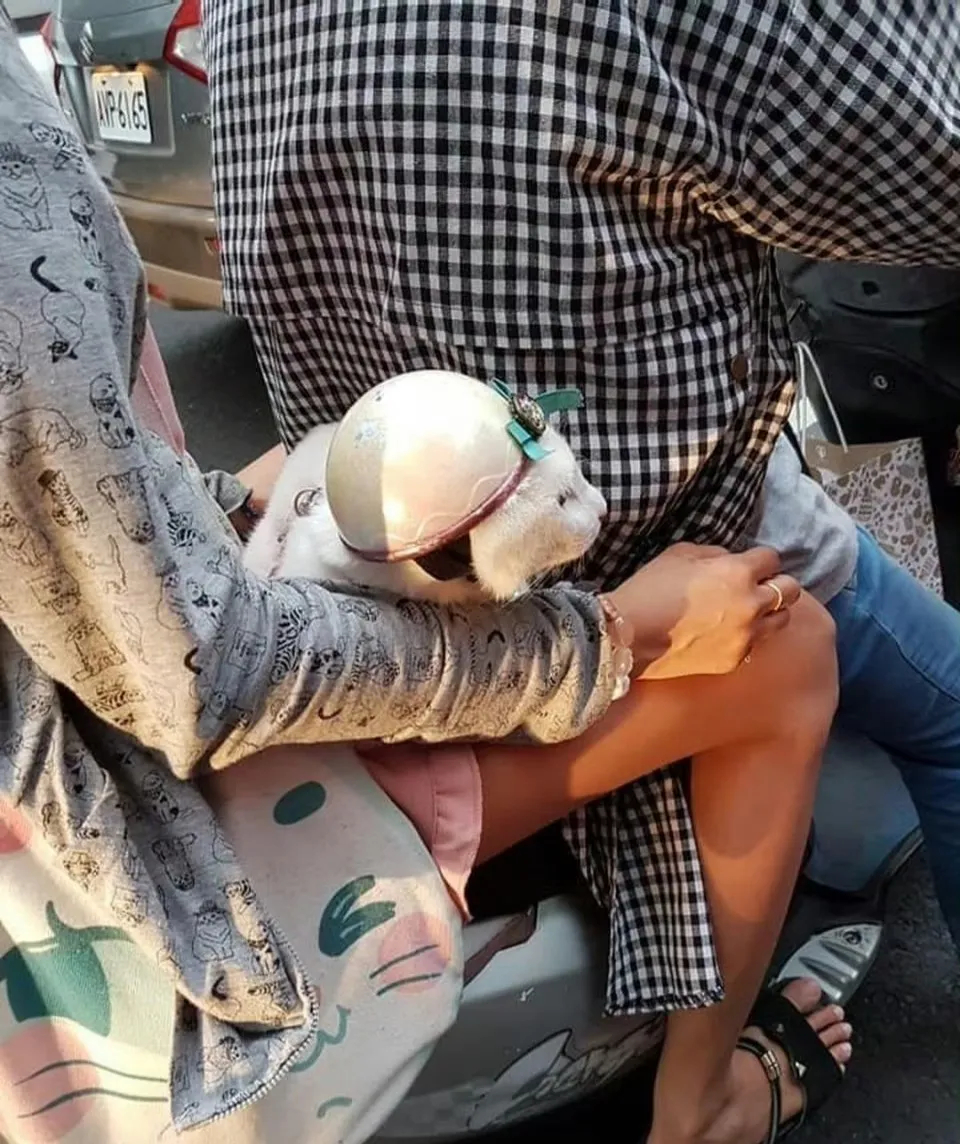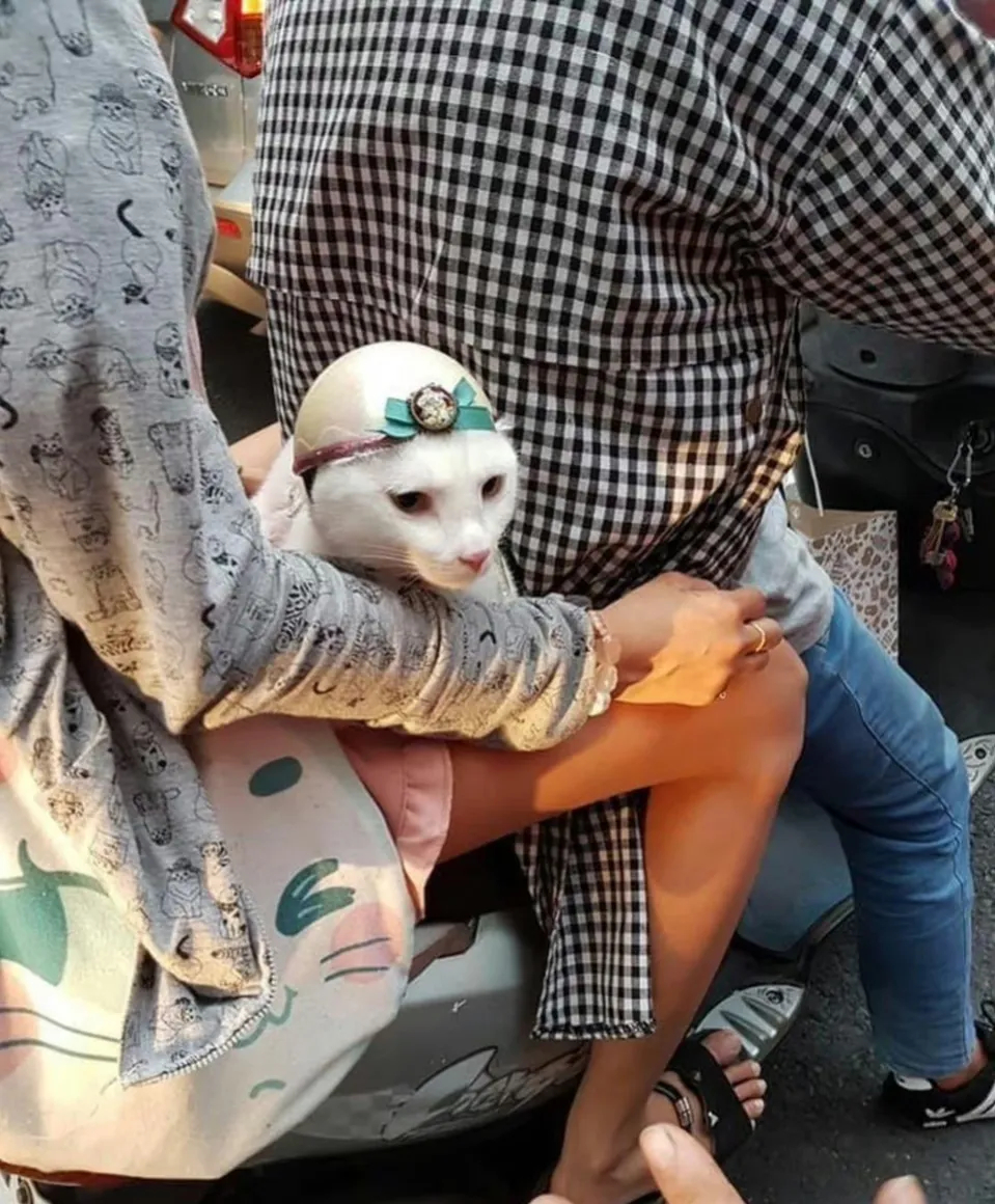 在大街上看到一对夫妻骑着电驴,他们竟然还带着一只猫咪。第一眼看去,那猫咪好像是从天竺来的小公举一般,等再仔细一瞧,才发现原来是猫咪头上戴着一顶可爱的小安全帽呀。