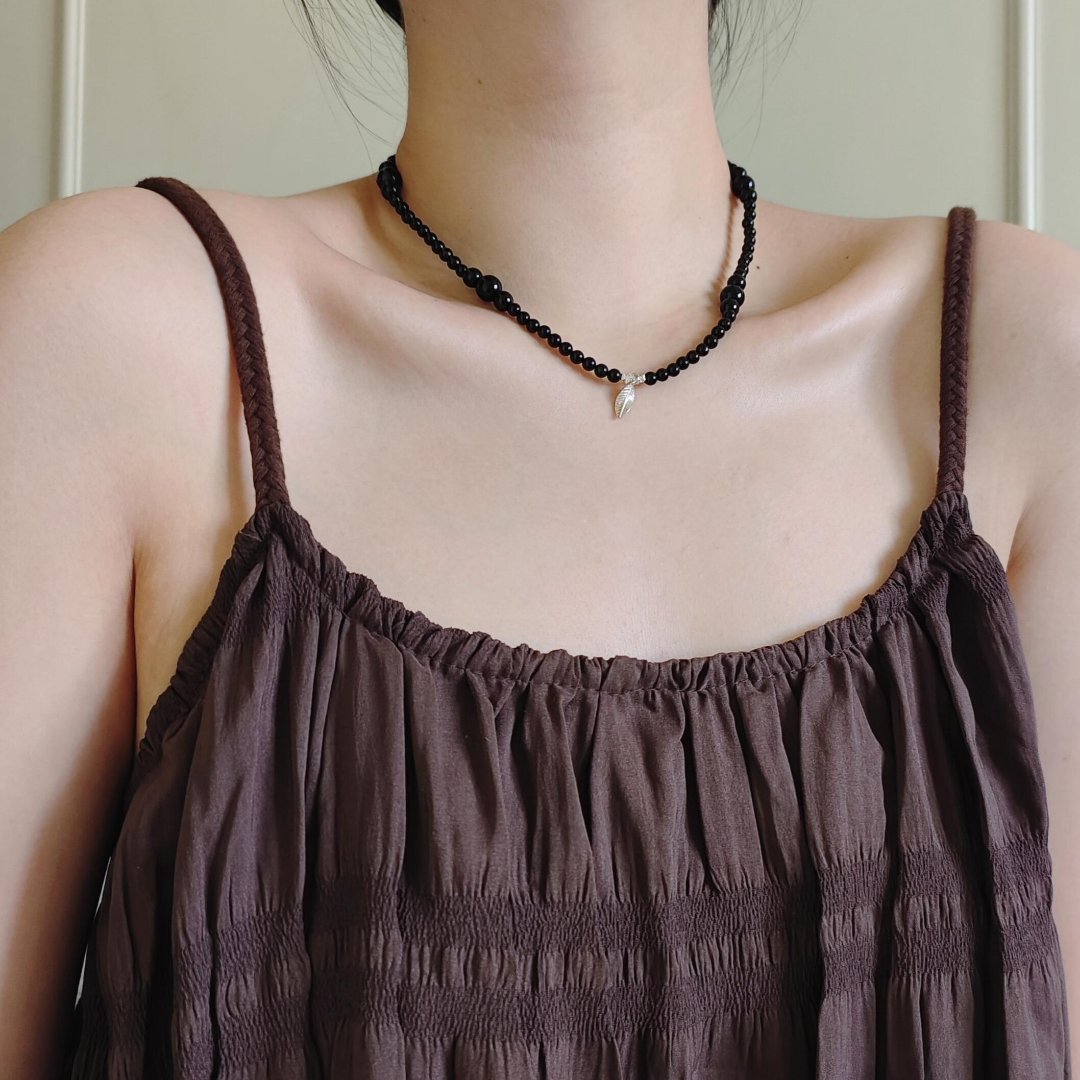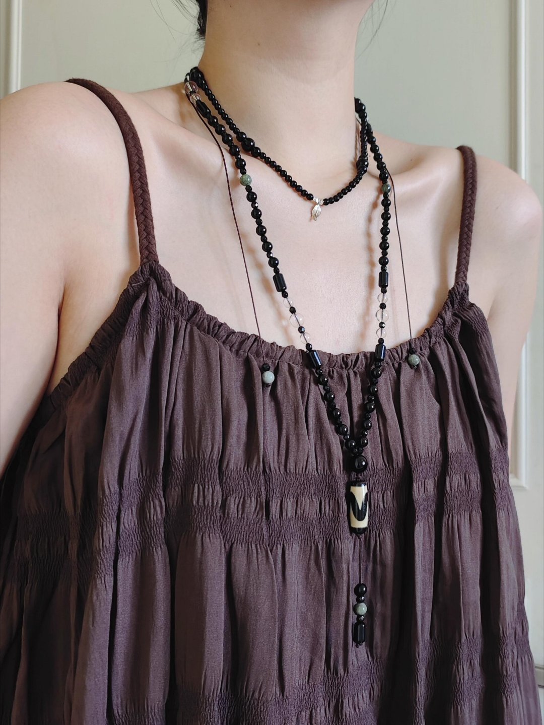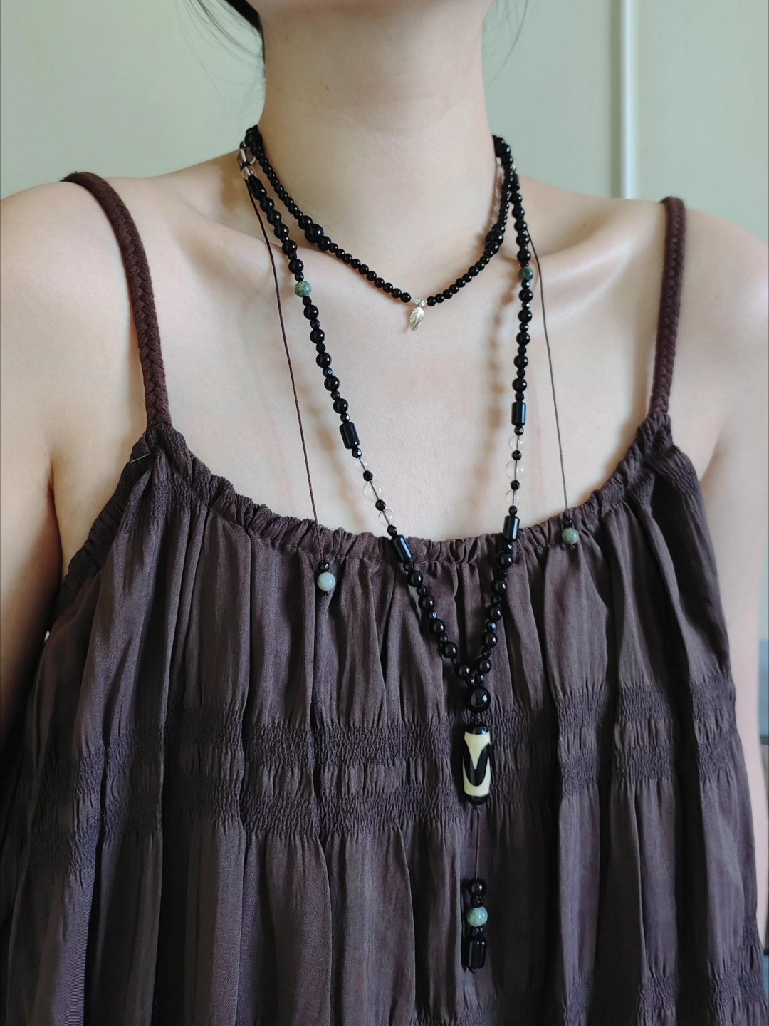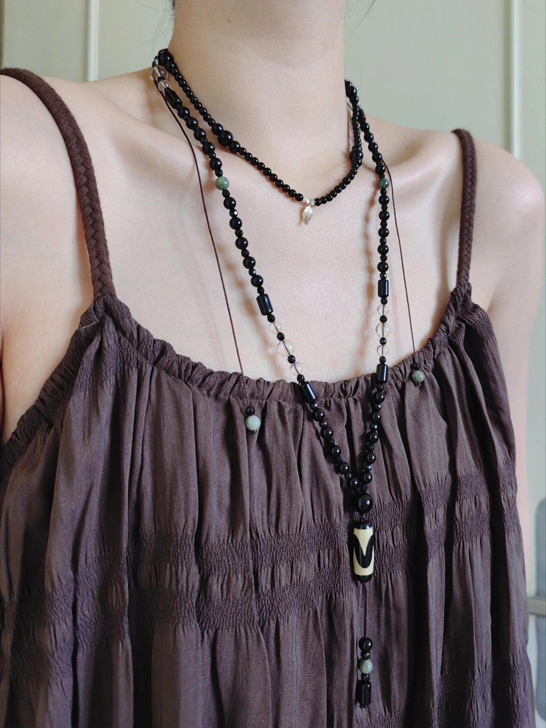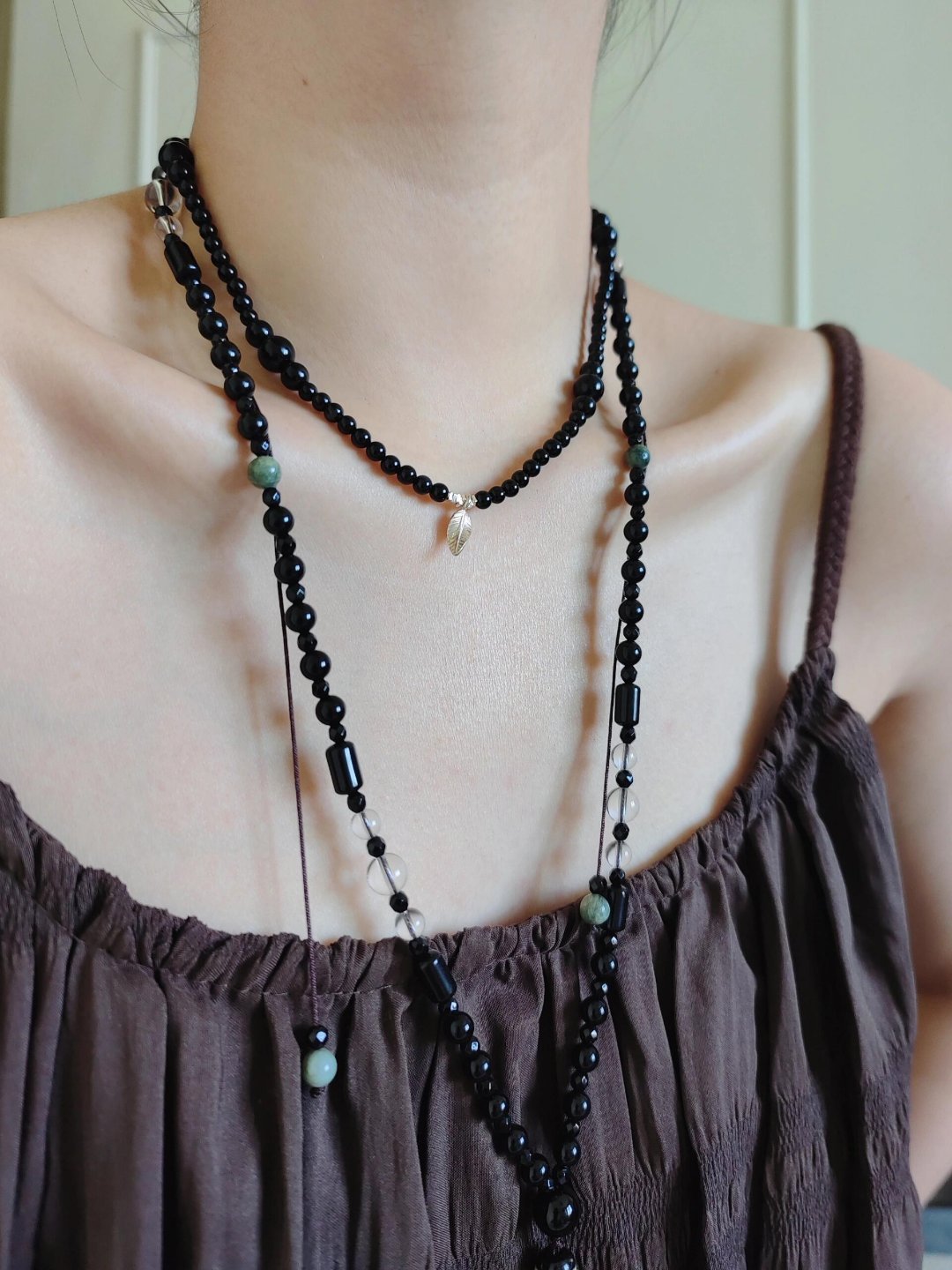 这组黑玛瑙叠戴项链把新中式美学拿捏得恰到好处,黑玛瑙混着通透琉璃珠与浅绿石珠,坠着复古纹络的长吊坠,自带沉静的东方韵味;叠搭的细链缀着小巧叶形挂饰,又很灵动。