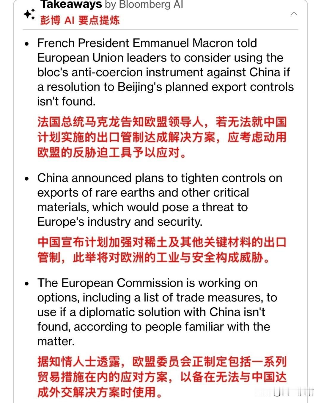 马惧内龙也是有点儿意思,老美搞他们欧洲的时候,没见他这么硬,老美针对老中的时候,没见他说句公道话,如今老中反击,本来就没针对他们,只是对他们也有点副作用,就跳起来表示强硬了…… 谁都知道老中只是反击老美,至于对你欧洲有点副作用,你只要好说好商量,也不是不可以调整,可你一上来就要玩硬的,这不是扯淡吗。 还有啊,最开始老美针对老中时,就是老特第一次当老板和老拜当老板时,那时候他们还没搞别的国家,你们欧洲是怎么一边看老中笑话一边给老美助拳的?是不是还想着老美打了老中能分你们一杯羹呢?要不是老特第二次上位后开始乱打一片,连你们都打,恐怕你们现在还帮他压制老中呢吧?所以如今中美对轰,刮到你们一点,你们不也活该吗,装什么老实人呢,你们自己干过什么自己不知道?
