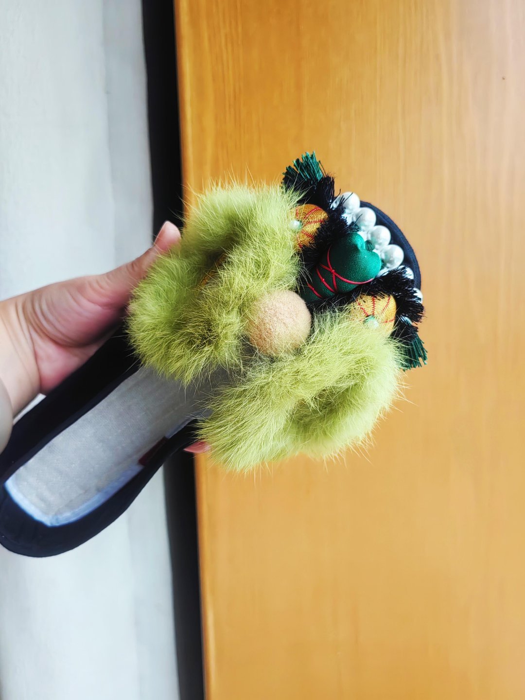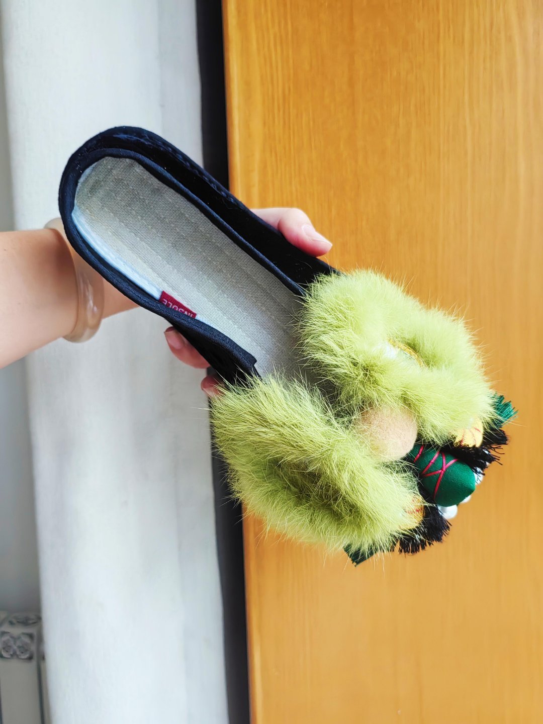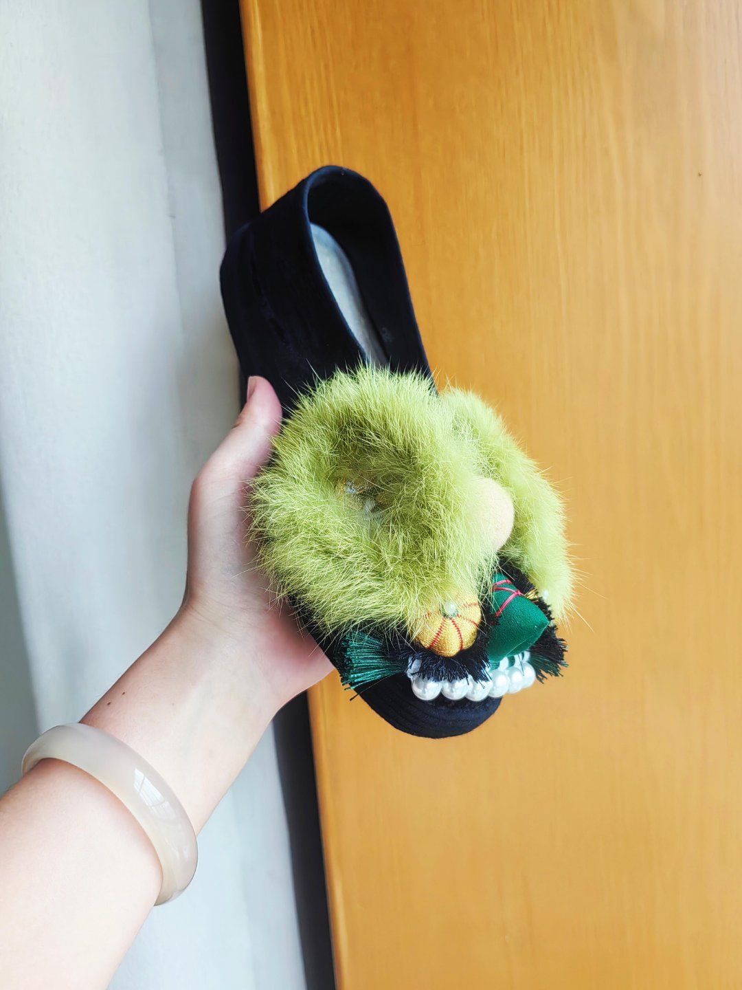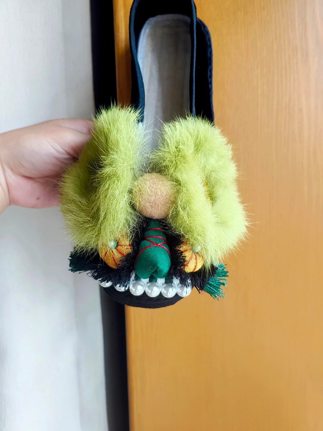 被这双黑色虎头穆勒鞋给种草了,鞋身是黑色丝绒布,鞋头装饰大面积嫩绿色毛绒,搭配绿色布艺、黄纹装饰球、珍珠串与黑绿流苏,细节层次丰富,色彩碰撞鲜明,复古又有个性。鞋内里为浅灰织物材质,时尚又有艺术感。时尚鞋履SOTD鞋控的日常