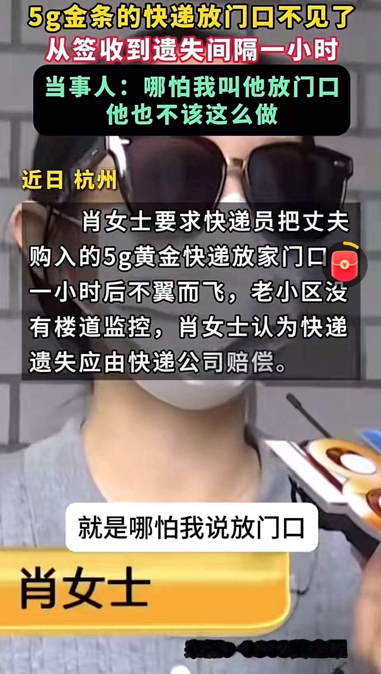 吵翻了!杭州萧山,女子要求快递员把装有5克金条的快递放门口,结果不到一个小时,金条不翼而飞!女子:”哪怕我叫他放门口,快递员也不该怎么做!他们应该赔偿!”快递员:“她让我放门口的,这丢了怎么能怨我! 这起看似普通的快递纠纷,却折射出我们这个时代人们对信任与责任的复杂心态。一个小小的金条快递,竟引发了如此激烈的争执,背后隐藏的却是我们每个人都可能曾经遇到或担忧的问题。 想象一下,作为一名快递员,每天要面对成百上千的包裹,责任重大,但也充满变数。尤其是在快节奏的生活中,客户的要求变得越来越苛刻,信任变得脆弱。女子坚持“放门口”,表面看似合理,但是否意味着她就可以对快递员的责任完全划清界限?还是说,这是对快递行业信任危机的一个缩影?她的“赔偿”请求,折射出人们对“责任归属”的固有预设:只要东西丢了,责任就应由别人买单。 而快递员的回应也很真实:“她让我放门口的,这丢了怎么能怨我!”这句话背后,透露着一种无奈和无力感。快递行业的繁忙与压力,让他们在执行任务时,常常处于被动状态。信任的缺失,让责任变得模糊不清。我们是否曾想过,每一次“放门口”的决定,都是在信任快递员的职业操守?但当事情发生变故,我们是否也应该反思:我们是否真的理解快递员的难处? 这场“金条失踪”事件,不仅仅是个别案例,更像是一面镜子,映照出当下社会对责任、信任与合作的深层次思考。我们每个人都希望生活在一个更有秩序、更有信任的社会里,但那需要的是每个人的理解与包容。对快递员来说,他们每天奔波在城市的每一个角落,承载着我们的期待和信任,也希望得到理解和尊重。 这起事件让我们不禁反思:在追求效率和便捷的同时,我们是否也在无形中丧失了人与人之间的基本信任?我们是否愿意放慢脚步,学会理解他人的难处?毕竟,社会的温度,不正是由每一次真诚的理解和责任感所温暖的吗? 读到这里,你是否也在心里默默叹息?一件小事,却揭示了大问题。我们期待的,是一个更懂得信任与责任的社会。因为,只有这样,才不会因为一块金条的失踪,而让人与人之间的关系变得冷漠和疏离。你怎么看?快来评论区告诉我你对这场“金条门”的看法吧!理解和尊重快递员