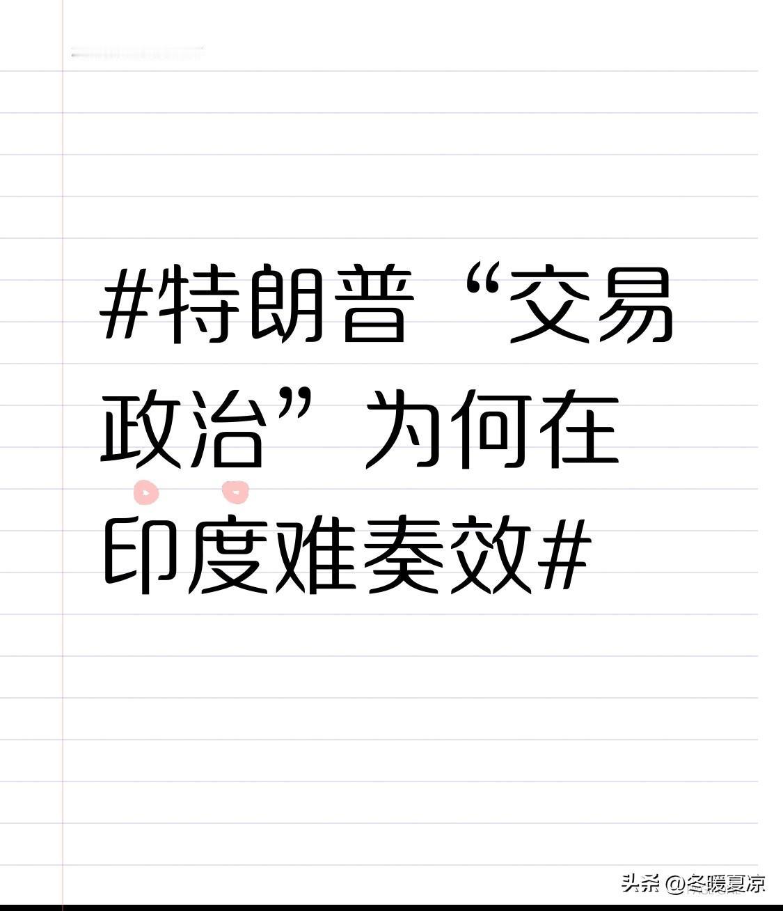 特朗普“交易政治”在印度难奏效,有多方面原因。特朗普以利益交换为核心的强权外交,把印度战略价值当作“交易价值”,但印度可不乐意被这么简单拿捏。 美国此前对印度商品征高额关税,还介入克什米尔问题,这让美印关系裂痕加深。从民意来看,美国皮尤民调显示近半数印度人反感特朗普贸易政策,反对其关税策略和贸易保护做法。此前美印贸易争端让两国互增关税,美国还取消印普惠制待遇。印度有着自己的战略定位和经济考量,不会轻易在特朗普的“交易政治”面前妥协。 从战略层面看,印度一直致力于在国际舞台上保持独立自主的姿态。它既想借助美国的力量提升自身在地区和全球的影响力,又不愿成为美国的附庸。印度与俄罗斯等国也保持着密切的合作关系,在军事装备采购等领域依赖俄罗斯。如果完全倒向美国,必然会影响与俄罗斯等传统伙伴的关系,这是印度不得不慎重考虑的。 在经济方面,印度近年来经济发展迅速,有着巨大的市场潜力。印度政府积极推动“印度制造”等计划,旨在提升本国制造业水平和经济的自主性。特朗普的贸易政策无疑是对印度经济发展的一种阻碍,印度自然会奋起反击。而且,印度在新能源、信息技术等新兴领域也有着自己的发展规划,不会为了迎合美国的利益而放弃这些战略方向。 此外,印度国内政治因素也不可忽视。不同政党和政治势力对于与美国的关系有着不同的看法。一些政党强调印度的主权和独立性,反对在外交和经济上过度依赖美国。这种国内政治的多元性也使得印度政府在面对特朗普的“交易政治”时不得不谨慎行事。 总之,特朗普企图用“交易政治”来迫使印度就范,注定是一场难以成功的博弈。印度会在维护自身利益的基础上,与美国保持一种既合作又斗争的微妙关系。