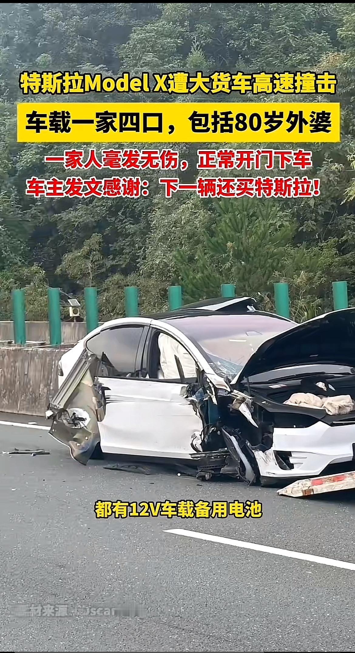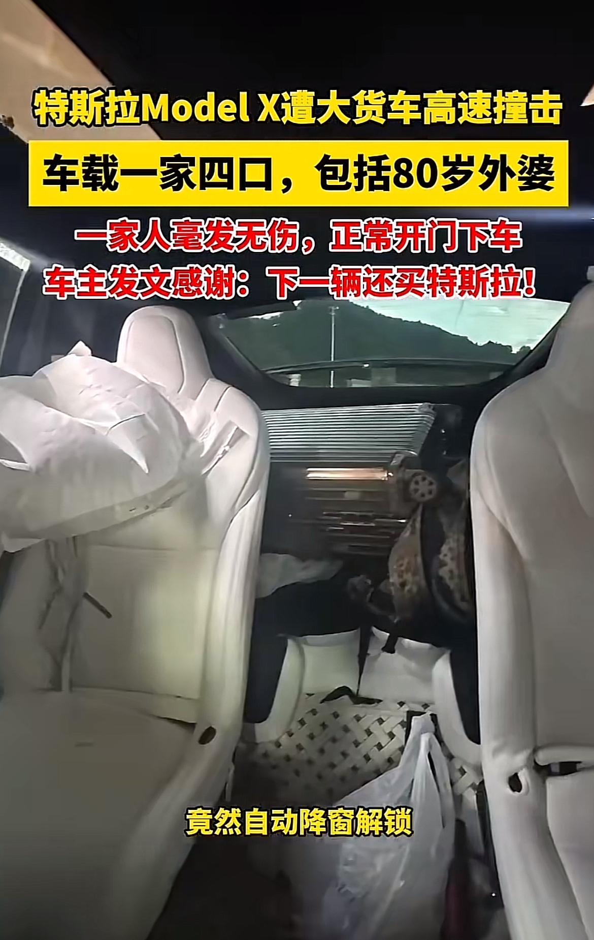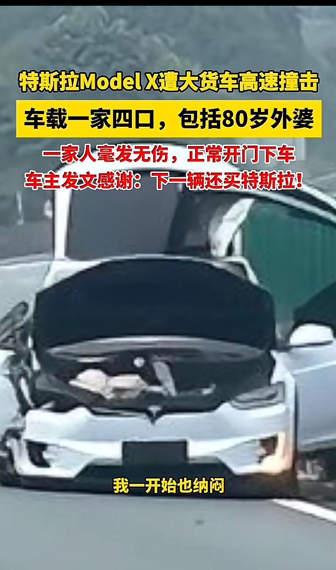 最近看到个惊人消息,一辆特斯拉Model X高速碰撞大货车,一家四口居然毫发无损,太牛了!之前也有特斯拉事故,像上海申嘉湖高速上,一辆Model 3被大货车追尾又钻进另一辆卡车底部,车顶压扁、玻璃全碎,车都快成废铁,可一家四口也都生还了。不过也有特斯拉追尾大货车司机死亡的案例,有的是自动刹车系统没起作用,疑似把大货车当背景墙。这次Model X一家平安,或许是底盘电池包等结构起了保护作用,只能说特斯拉在安全性能上有亮点,但也存在一些有待解决的问题。