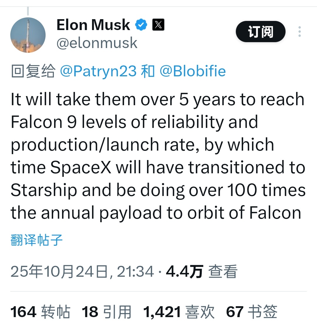 马斯克在社交平台评论表示;蓝箭航天“朱雀三号”需要5年多时间才能达到猎鹰9号的可靠性,生产和发射频率。届时,SpaceX发射任务已过渡到星舰,并将猎鹰9号年度100倍以上有效载荷送入轨道。