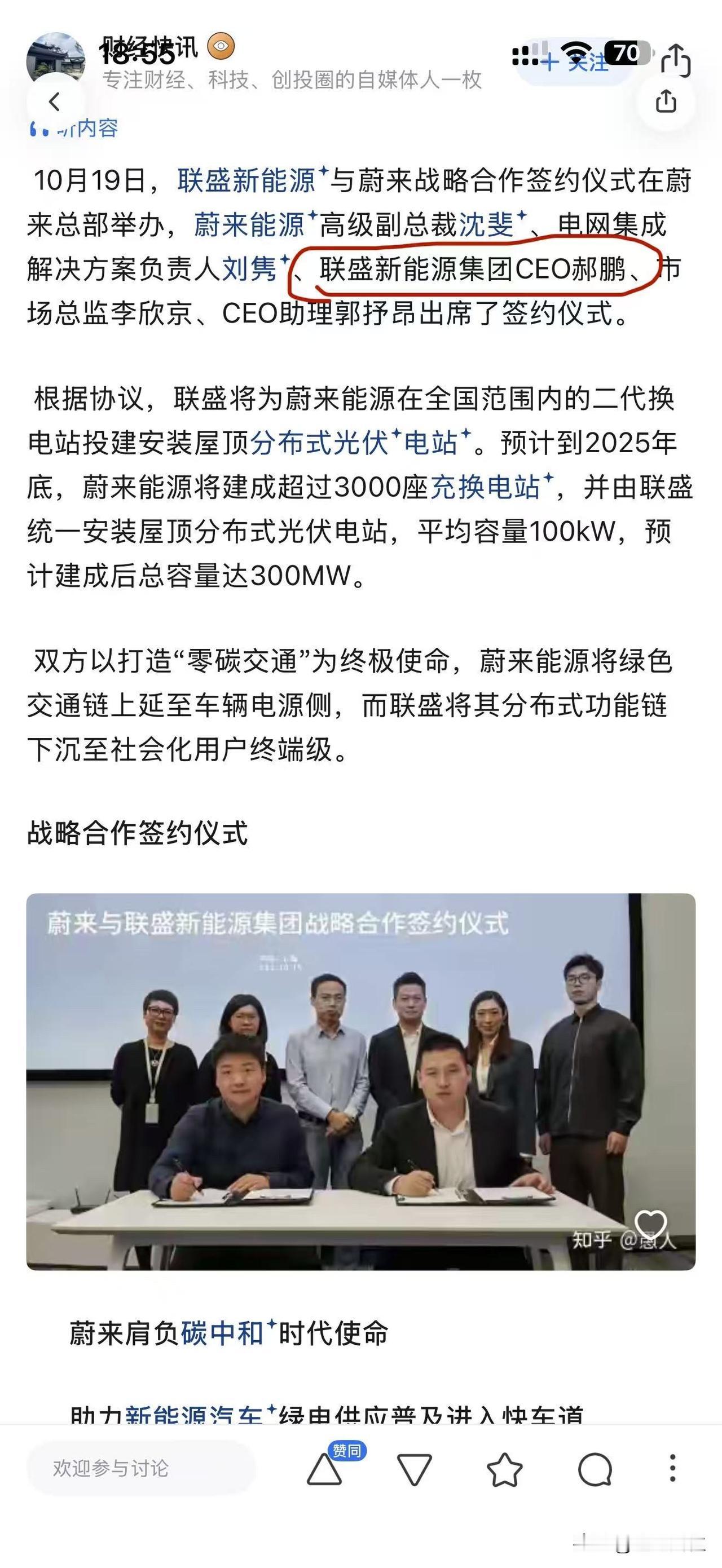 10月19日,联盛新能源*与蔚来战略合作签约仪式在蔚来总部举办,蔚来能源*高级副总裁沈斐*、电网集成 解决方案负责人刘隽 联盛新能源集团CEO郝鹏、市场总监李欣京、CEO助理郭抒昂出席了签约仪式。 没想到这位CEO开着理想的车和蔚来战略合作,还在蔚来家门口出事; 好吧,这一次总裁应该考虑换一部蔚来了吧。