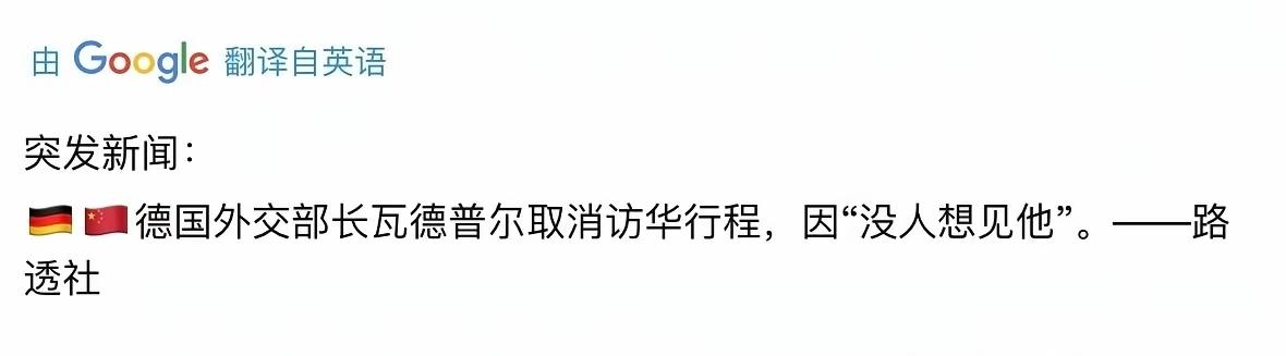 彻底傻眼了!来自10月24日德国媒体的消息说,德国外长访问我们的行程计划被取消了。 来自英国路透社的消息说,德国外长访问行程取消的原因,是因为没有人愿意见他。 事实上,这就说明,从当前的情况来看,德国外长刚刚放出风声准备来访问,而且言之凿凿的说要在某些方面对我们提出要求,特别是要让我们放开对稀土的管制,而且还要在一些重要问题上对我们提出要求。只是没有想到这个消息刚刚放出没多久,我们直接就给出了这样一个答案。 这样的情况让他们直接傻眼了。从目前的情况来看,西方国家必须要改变自己的想法,必须要从尊重的立场出发与我们沟通,否则面临的就是这样的结果。 西方国家不要再以为和以前一样,以一种高高在上的表态对待我们。