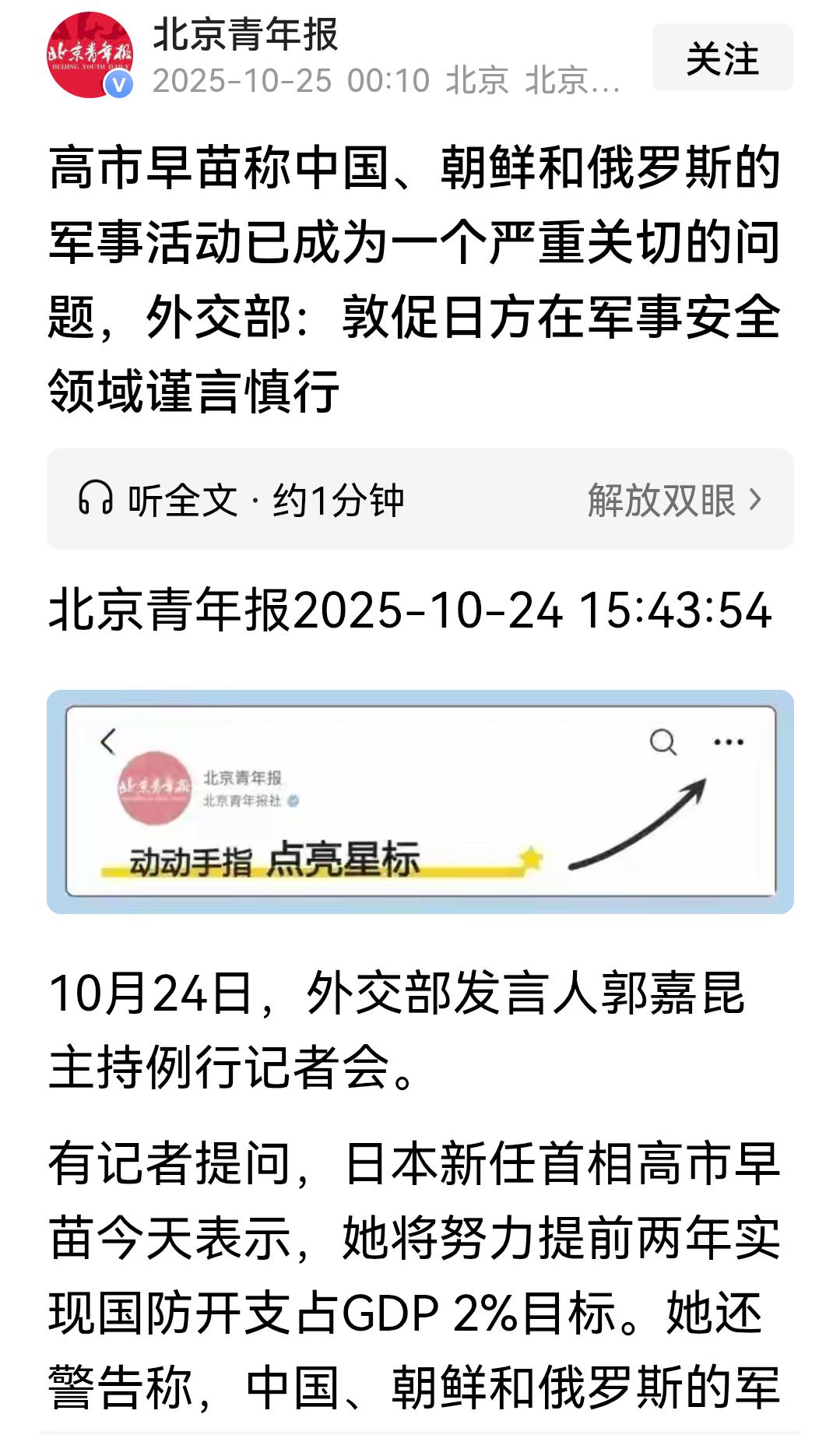 日本首相高市早苗上任伊始,就把矛头对准了中俄朝! 最近,高市早苗称,中国、朝鲜和俄罗斯的军事活动已成为严重关切,对此,她将大幅度提高国防开支,努力提前两年实现国防开支占GDP百分之二的目标。 不久前,她还在施政演说里软化对华立场,称要和中国加强对话建立“战略互惠关系”,现在刚上台就呲出了獠牙。 我们要听其言,更要观其行,毕竟高市早苗是靠民粹反华立场上位的。现在刚上台根基不稳不得不收敛着尚且如此,不知以后会不会有更危险的动作。