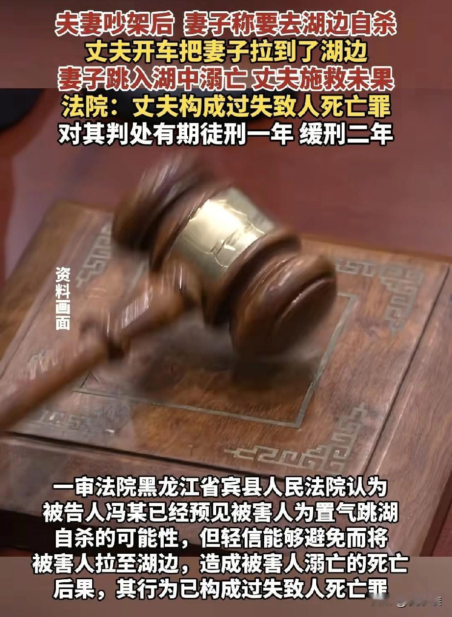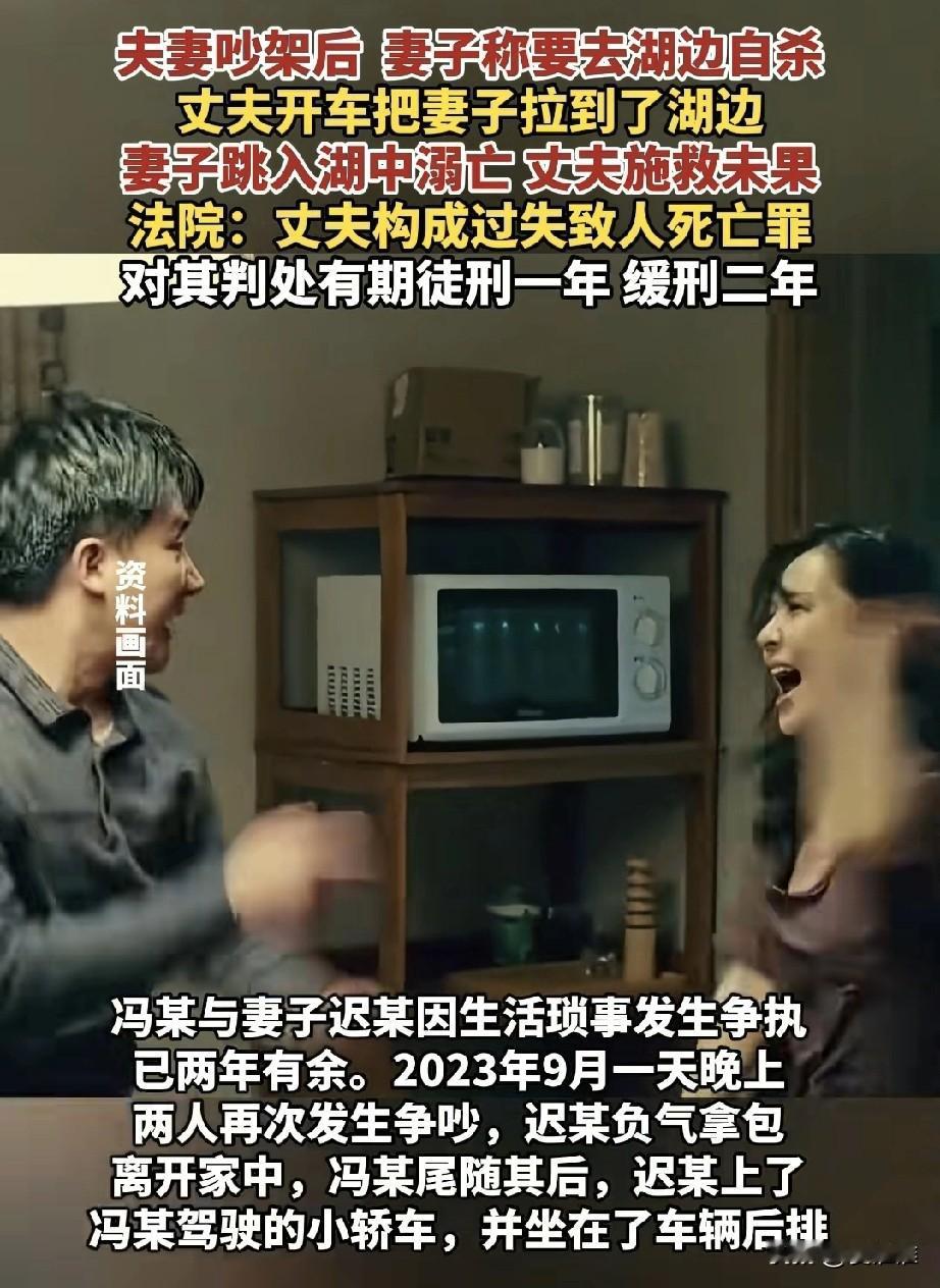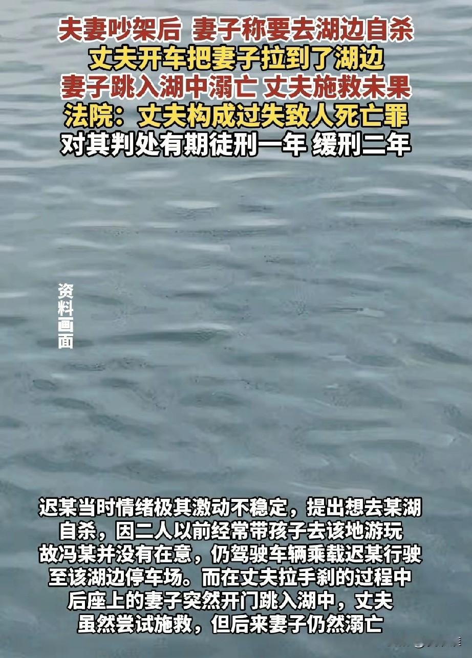 夫妻吵架吵得不可开交,气头上的妻子对丈夫说:你带我去河边吧,我想跳河。不以为然的丈夫以为妻子只是气话,就带着她去了河边,没想到刚下车妻子就跳进了河中,男子紧随其后跳进河中施救,却没有救上来,男子以过失致人死亡罪被判一年缓刑! 深秋的东北小城,夜色总是来得特别早。晚上八点多,小区里已经没什么人影,只有几盏昏黄的路灯在冷风中摇曳。冯某和妻子迟某的争吵声就是从三楼那扇亮着灯的窗户里传出来的,断断续续,像这个季节特有的寒凉,已经持续了整整两年。 “我受够了!”迟某猛地抓起沙发上的挎包,声音带着哭腔。她快步走向门口,防盗门“砰”的一声在冯某面前关上。冯某在原地站了几秒,叹了口气,还是抓起车钥匙跟了下去。 单元门前的空地上,迟某背对着他,肩膀在微微颤抖。“你别跟着我!”她转过头,路灯的光照在她泪痕未干的脸上,“我要去月牙湖,这次真的不想活了。” 月牙湖,这个名字让冯某心里咯噔一下。那是他们一家三口周末常去的地方。 “别说气话了,”冯某试图去拉她的手,“回家吧,孩子还在家等我们。” 迟某猛地甩开他,径直拉开停在路边的黑色轿车后门坐了进去。“带我去月牙湖。”她的声音异常平静,这种平静反而让冯某感到不安。他犹豫了一下,还是坐进了驾驶座。 车子缓缓驶出小区,融入夜色。后视镜里,迟某一直望着窗外,一动不动。冯某几次想开口,却不知该说什么。这两年来,为孩子的教育,为房贷,为生活中那些说不清道不明的压力,他们之间的争吵越来越频繁。他以为这次也像往常一样,只是妻子在气头上。 月牙湖离他们家不过二十分钟车程。夜里九点多的湖边停车场空荡荡的,只有远处隐约可见几个夜钓者的灯光在湖面上摇曳。冯某把车停稳,右手刚拉到电子手刹,就听到后车门“咔哒”一声开了。 “你干什么!”冯某惊呼。但迟某已经冲了出去,她的身影在夜色中像一片飘零的叶子,径直朝着黑漆漆的湖面奔去。 冯某慌忙解开安全带下车,冰冷的空气瞬间包裹了他。他看见妻子的背影在湖边略微停顿了一下,然后毫不犹豫地踏进了湖水。 “迟某!回来!”冯某边跑边喊,鞋子在碎石路上打滑。湖水很冷,这是他踏进水里后的第一个念头。东北九月的夜晚,湖水已经刺骨。他拼命向前趟着水,水很快没过了大腿、腰部。黑暗中,他勉强能看到妻子漂浮的衣角。 “抓住我!”他伸出手,指尖几乎触到了她的衣服,但一个浪头打来,她又远了一些。冯某不会游泳,这个他从未觉得是问题的缺陷,此刻成了无法逾越的障碍。水已经没到了胸口,呼吸变得困难。 “救命啊!有人落水了!”他声嘶力竭地呼喊,声音在空旷的湖面上显得格外无助。 远处的夜钓者听到了呼救,有人拿着鱼竿跑了过来。一根长长的鱼竿伸到冯某面前,他紧紧抓住,另一只手仍然朝着迟某的方向徒劳地伸着。可是太远了,鱼竿根本够不到她。 “我去救她!”冯某试图继续往前,但湖水更深了,一个趔趄,他差点整个人没入水中。夜钓者在岸上死死拉住鱼竿,“不行!你这样也会没命的!” 冰冷的湖水让冯某的四肢开始麻木。他眼睁睁看着那片衣角在黑暗中起伏了几下,然后彻底消失了。湖面恢复了平静,仿佛什么都没有发生过。 警笛声由远及近,红蓝色的灯光划破了湖边的夜空。消防救援、公安民警陆续赶到,强光手电在湖面上来回扫射,但除了荡漾的波纹,什么也看不见。冯某裹着救援人员给的保温毯,呆呆地坐在岸边,浑身湿透,嘴唇发紫,不知是因为寒冷还是恐惧。 打捞工作持续到第二天下午。一点多,当迟某的身体终于被打捞上岸时,周围一片寂静。她看起来像是睡着了,只是再也不会醒来。 尸检报告上“生前溺死”四个字像针一样扎在冯某心上。检察机关以过失致人死亡罪对他提起公诉,庭审那天,他穿着一件灰色的夹克,显得格外憔悴。 “我没想到她会真的...”冯某在法庭上声音哽咽,“我们以前也常吵架,她说过气话,但从没有...” 辩护律师出示了谅解书——迟某的年迈父母原谅了这个女婿,他们知道,女儿的死对冯某已经是最大的惩罚。还有两个年幼的孩子需要抚养,一个家庭已经支离破碎,不能再失去更多。 法院的判决书里这样写道:“被告人冯某已经预见被害人为置气跳湖自杀的可能性,但轻信能够避免而将被害人拉至湖边,造成被害人溺亡的死亡后果...” 过失致人死亡罪成立,有期徒刑一年,缓刑二年。 走出法庭时,外面下起了小雨。冯某没有打伞,任由雨丝打在脸上。他想起两年前的一个周末,也是在这个月牙湖,儿子在放风筝,迟某笑着递给他一瓶水,阳光照得她眯起了眼睛。那时他觉得,生活虽然平凡,却足够幸福。 如今湖水依旧,而那个会笑着递给他水的人,永远留在了这片冰冷的湖水里。他知道,往后余生,每一次经过这个湖边,他都会想起那个夜晚——他停下车,拉下手刹,然后永远地失去了她。有些错误,一旦铸成,就再也没有挽回的余地;有些伤痛,即使用尽余生,也无法真正愈合。