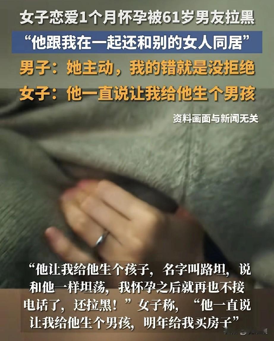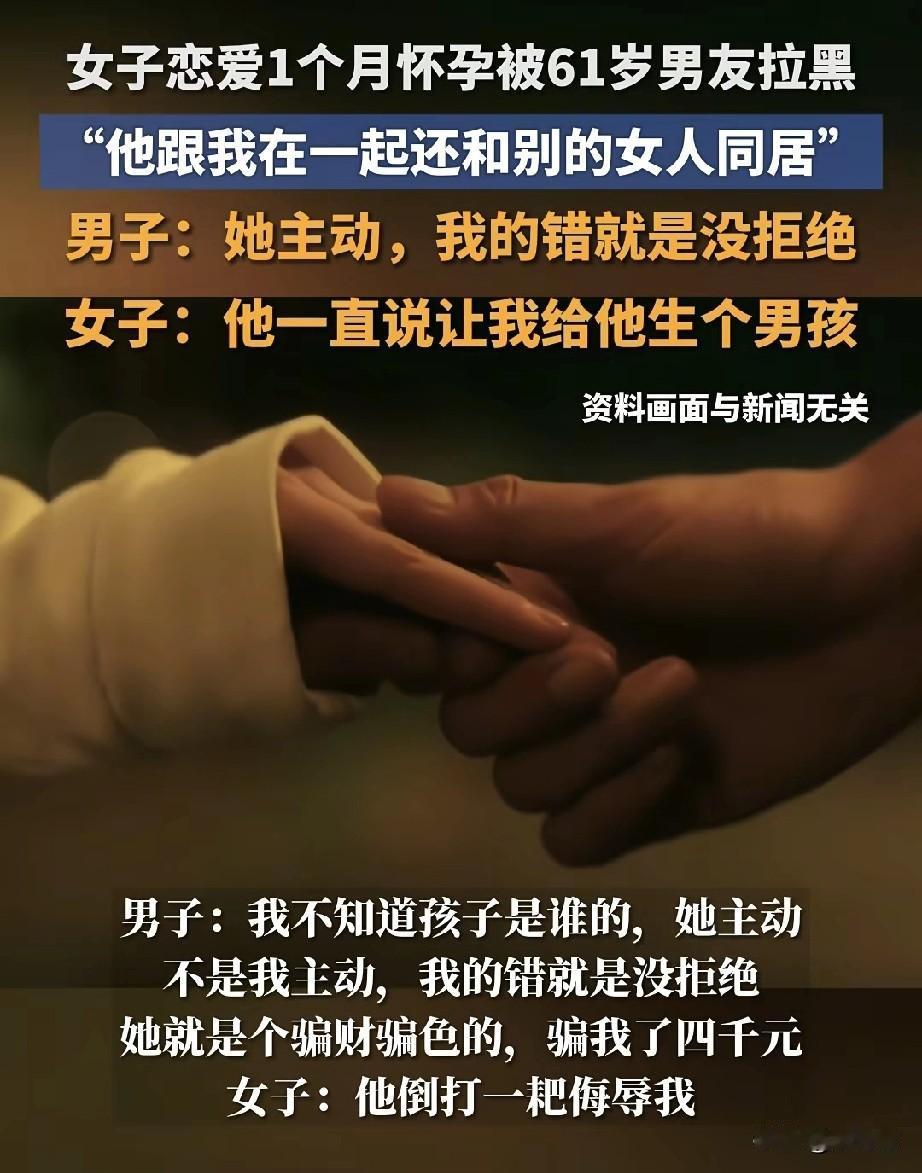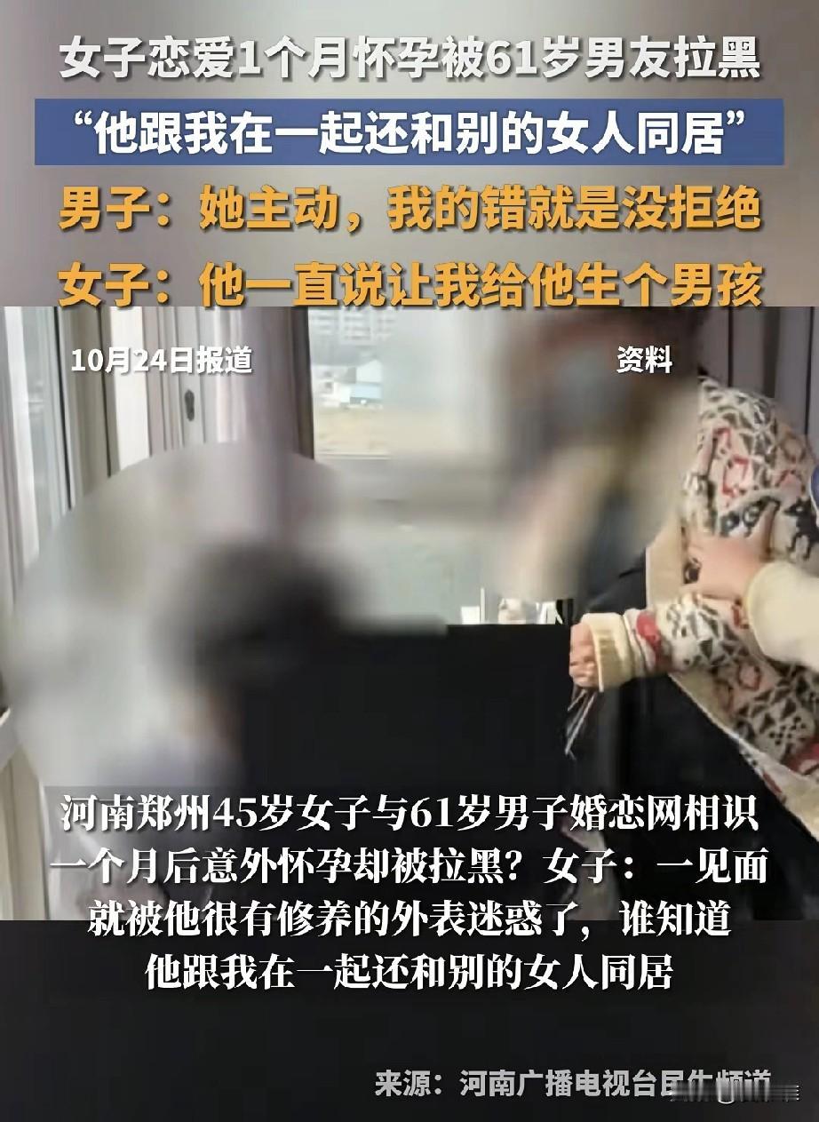 “荒唐的恋情!”河南郑州45岁女子网上结识61岁男子,男子承诺:“你给我生个男孩,我娶你,还给你买套房子。”双方交往一个月之后,女子发现自己怀孕,然而61岁男友却玩失踪,当女子辗转找到他时,发现男友竟然和另外女子在同居,还不承认女子腹中的孩子是自己的! 四十五岁的安女士独自带着孩子生活,在郑州这座偌大的城市里,离异后的日子过得并不轻松。 母亲的频频催促,让她对一份安稳的感情愈发渴望。 就在一个月前,通过网络,她结识了六十一岁的路先生。初次见面,路先生谈吐得体,衣着整洁,那种岁月沉淀下来的“修养”外表,像一道光,瞬间照进了安女士期盼归宿的心。 她几乎没怎么犹豫,便投入了这段关系,心里默默期盼着,这或许就是母亲口中、也是自己心底期盼的那个“着落”。 交往期间,路先生曾不止一次地描绘过未来的蓝图,“等将来我们有了孩子就给他起名叫坦途,”说是希望孩子像他一样“坦荡”为人。 这些话语,像甜蜜的糖衣,包裹着安女士对未来的憧憬。 然而,这层糖衣虽然甜蜜但融化得飞快。 一个月后安女士发现自己怀孕,当她拿着显示怀孕的化验单,满怀忐忑与一丝希冀地想要告诉他这个消息时,却发现对方的电话再也无法拨通,所有的联系方式都躺在了冰冷的黑名单里。曾经的“坦荡”承诺,此刻显得无比讽刺。 愤怒与不甘驱使着安女士,她几经周折,终于在记者的陪同下找到了路先生的住处。 开门的那一刻,面对突如其来的安女士和镜头,路先生脸上掠过一丝慌乱,但随即态度就强硬了起来。 当安女士质问他为何拉黑自己、对腹中胎儿不负责任时,路先生语出惊人:“我们总共才相处了一个月,你怎么能证明孩子就是我的?” 他反咬一口,指责安女士“主动投怀”,甚至声称自己才是受害者,“她是骗子,骗财又骗色,骗了我四千块钱!” “骗钱?”安女士气得浑身发抖,积压的委屈和怒火瞬间爆发,她冲上前去抡起拳头就想打他,“你胡说!你侮辱人!”现场顿时一片混乱。 在众人的阻拦和质问下,路先生竟直接指向屋内,坦然承认那里住着另一位女性:“这才是我女朋友!你是趁我们感情出现问题时插进来的,我觉得我们不合适,早就想结束了!” 这番话如同平地惊雷,坐实了安女士此前关于他“还有其他女人”的猜测。 原来,那份她以为专属的“感情”,自始至终都存在于一个拥挤的三角关系里,而她,在对方的口中,却成了不合时宜的“闯入者”。 面对这剪不断、理还乱的情感与债务纠纷,双方各执一词,真相扑朔迷离。 安女士坚称路先生是倒打一耙,玷污她的清白;路先生则一口咬定自己遭遇了骗局。 最终,这场闹剧引来了警方介入。 在现场,调解的民警给出了理性的建议:若私下协商无法解决争议,双方可以通过法律途径来理清责任。 而对于那个尚未出世、被寄望名为“路坦”的孩子,民警也明确指出了一个关键方向——待孩子出生后,若仍需认定父子关系并追索抚养费,法定的亲子鉴定将是解决问题的必经一步。 这场荒唐的感情在短短一个月内经历了“怀孕”的意外与“拉黑”的终结,最终在警方的介入下暂告段落,只留下了一地鸡毛!