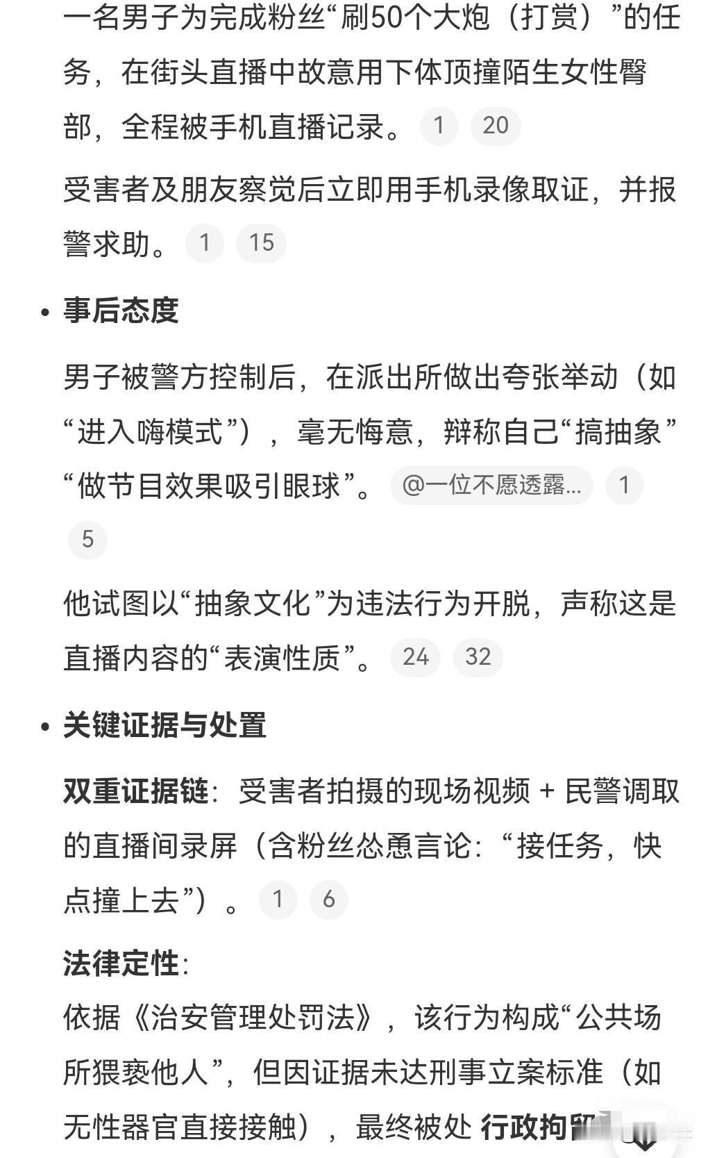 这男的真的是太下头了。 竟然为了网友的打赏,当街猥亵女生。 用下体多次顶撞女生臀部。 10月25日媒体报道了这么一起案例。 案例源自于《守护解放西》。 被抓后男子竟然声称自己是在搞抽象。 这真的是太可笑了。 这是犯罪,难道他会不知道? 狡辩是没有用的。 男子最终被拘留12日。 这真是大快人心。 此事也敲响了警钟。