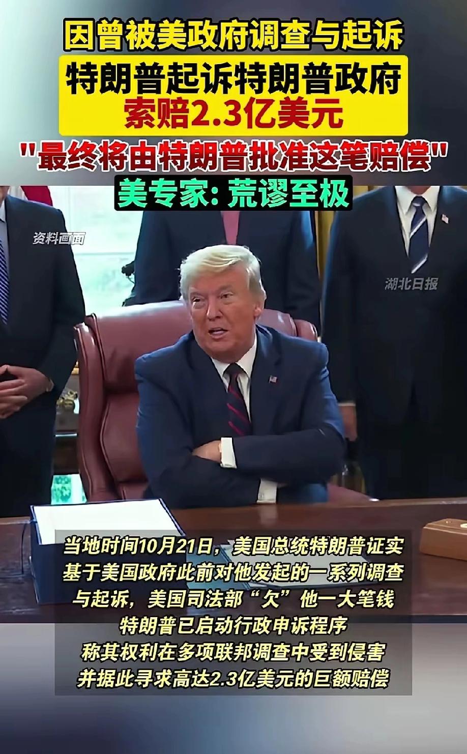 特朗普这波操作真是绝了!当地时间10月21日,他证实要美国司法部支付2.3亿美元赔偿,理由是任期结束后遭到刑事调查。关键是,最终审批权还在他自己手上,自己起诉自己再自己批准赔偿,这要是成了,绝对史无前例。 这索赔源于之前“通俄门”“泄密门”等调查。有潜在道德冲突不说,他还称不会私吞赔偿金,要捐给慈善或用于白宫翻建宴会厅。而此时白宫东翼楼正在施工,他说没花纳税人一分钱。说到底,这闹剧还是钱闹的,不知道最后会怎么收场。