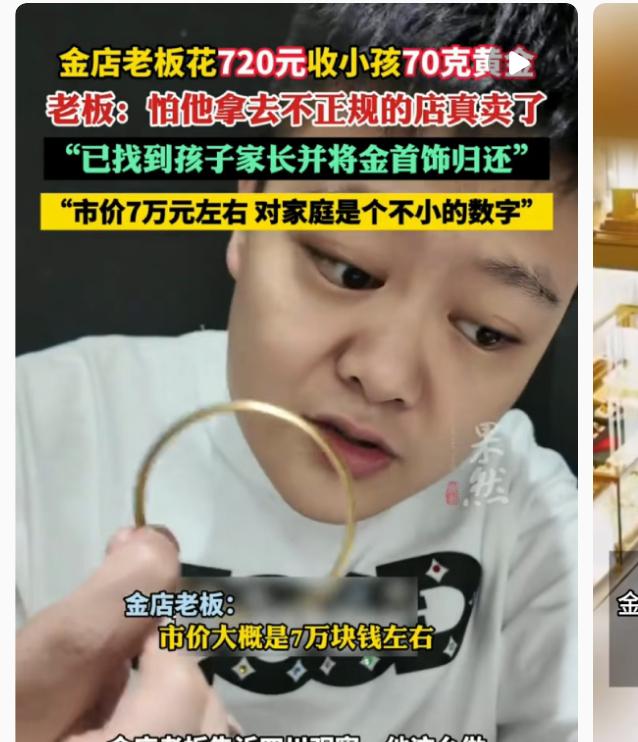 金店老板火了!不是因为金价涨得猛,也不是因为款式多新潮,而是10块一克收了小孩黄金这事儿。 老板说要是不收,孩子可能去不正规的店真卖了。他没按市场上一千多一克的价收,就用10块一克把金饰留下,就怕孩子闯祸。 收完他赶紧拍视频找家长,还留了地址。等联系上家长,原封不动把金饰还回去,这哪是做买卖,分明是帮着家庭止损呢。 这样的老板,不火谁火?