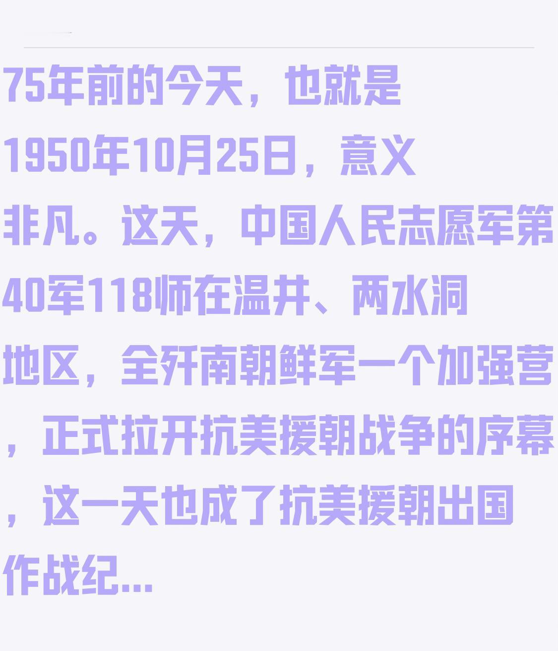 75年前的今天,也就是1950年10月25日,意义非凡。这天,中国人民志愿军第40军118师在温井、两水洞地区,全歼南朝鲜军一个加强营,正式拉开抗美援朝战争的序幕,这一天也成了抗美援朝出国作战纪念日。 当时新中国刚成立,百废待兴,美国却是头号强国。1950年美国国民生产总值2848亿美元,钢产量8772万吨,而中国工农业生产总值仅100亿美元,钢产量60万吨。实力悬殊,但为了保家卫国,志愿军毅然出征。此后激战云山城、血战长津湖、惨烈上甘岭……先辈们的英勇永远值得铭记。