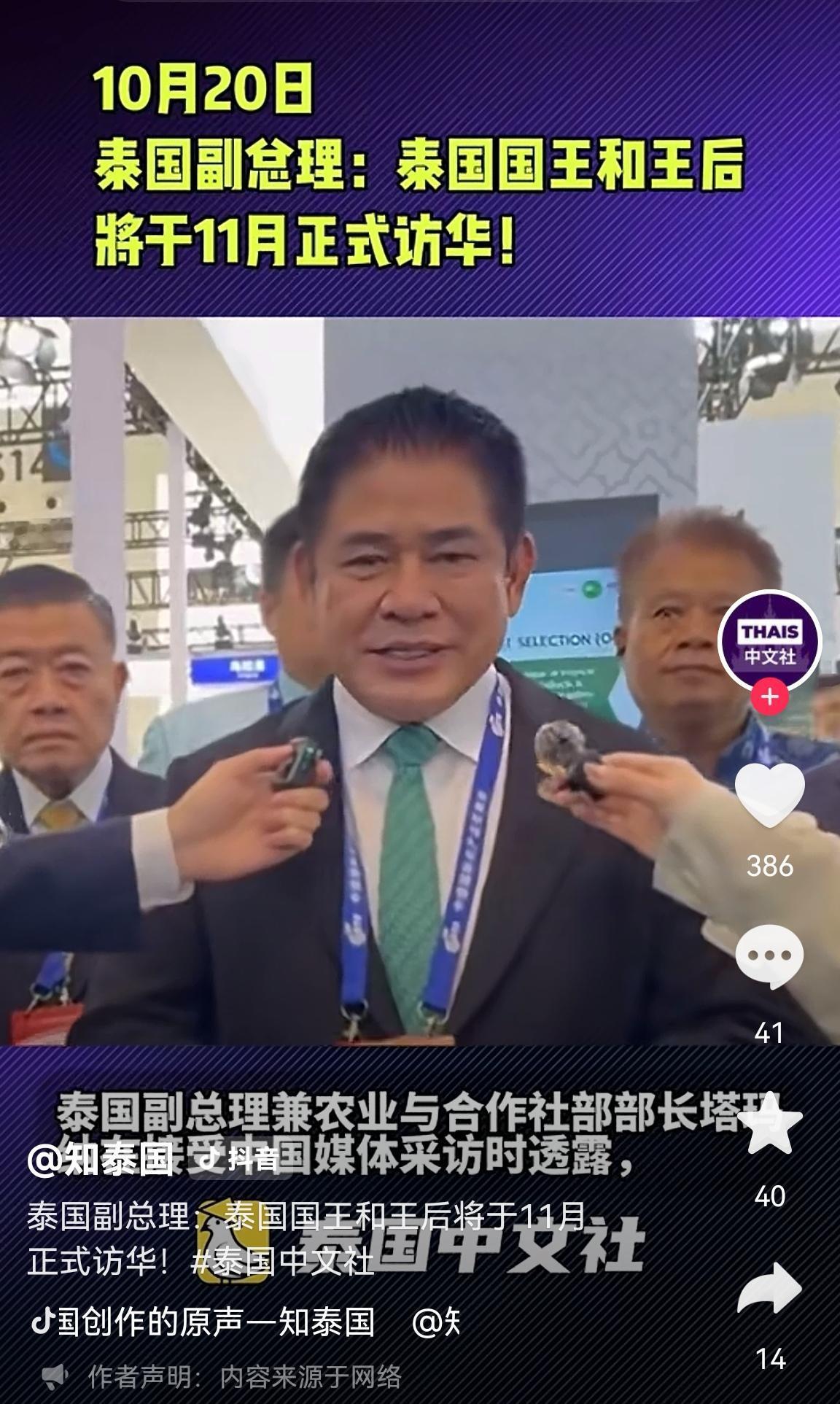 确认了, 就是几百年来泰国在位国王首次访问中国! 泰国副总理公布,泰国王夫妇将于11月正式来华访问。 熟知东南半岛的人都知道,这块200多万平方公里的土地上有暗暗较劲的两个国家。 那就是泰国与越南。 虽然越南最近对华也频频释放友好信号,因为历史原因越南不会购买我国军备。 但泰国可以,这就是差别。 所以期待这次访问后,除了经济上的交流,军购交流上能再次取得更大突破。