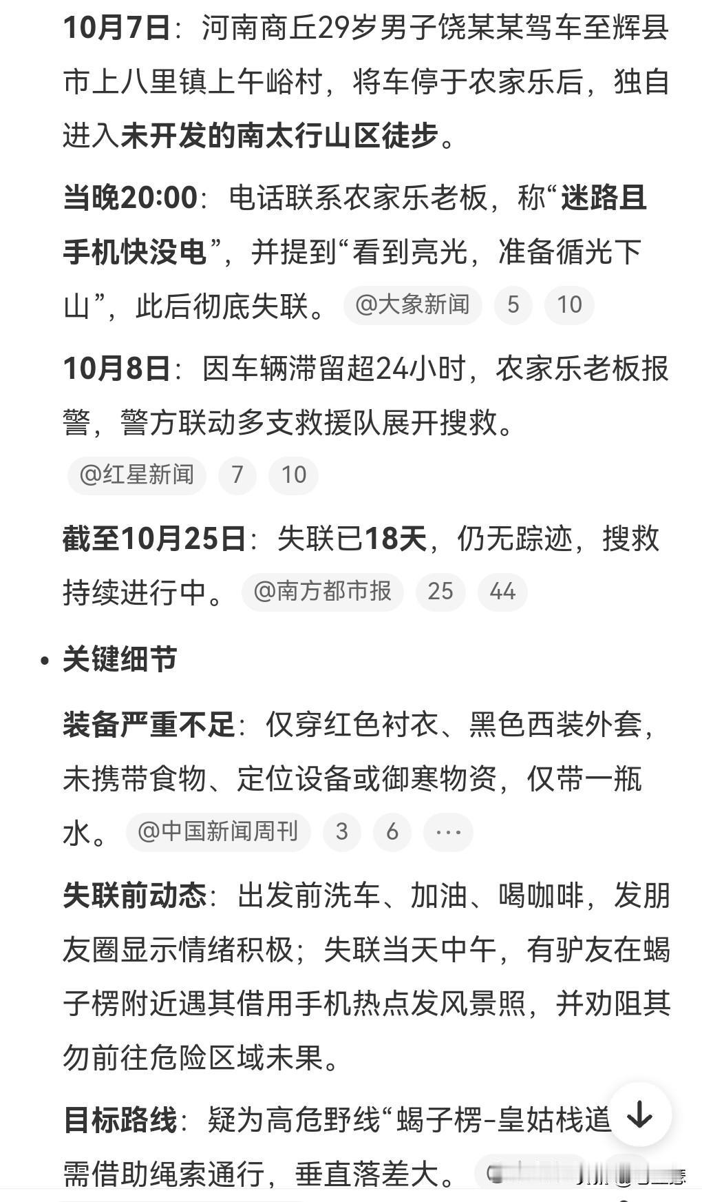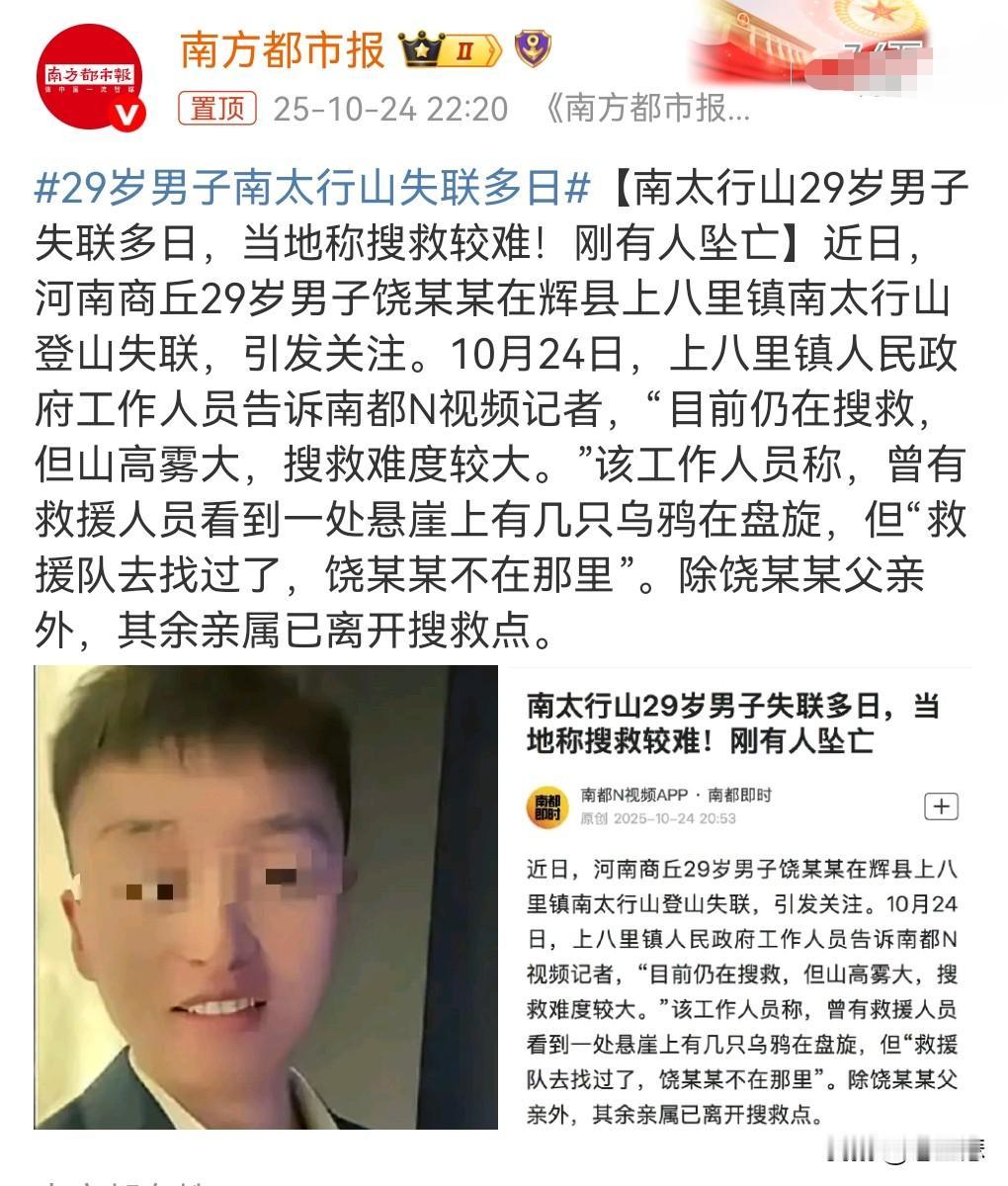 这真的是凶多吉少了。 29岁男子南太行山失联多日。 独自去到未开发的区域。 登山有危险,会遇到各种各样的情况,不要干这种事情。 更不能去到未开发的地方。 很容易迷路的。 10月7日失联,已经将近20天了。 这真是敲响了警钟。 当地回应称刚有人坠亡。 这不是个案啊。