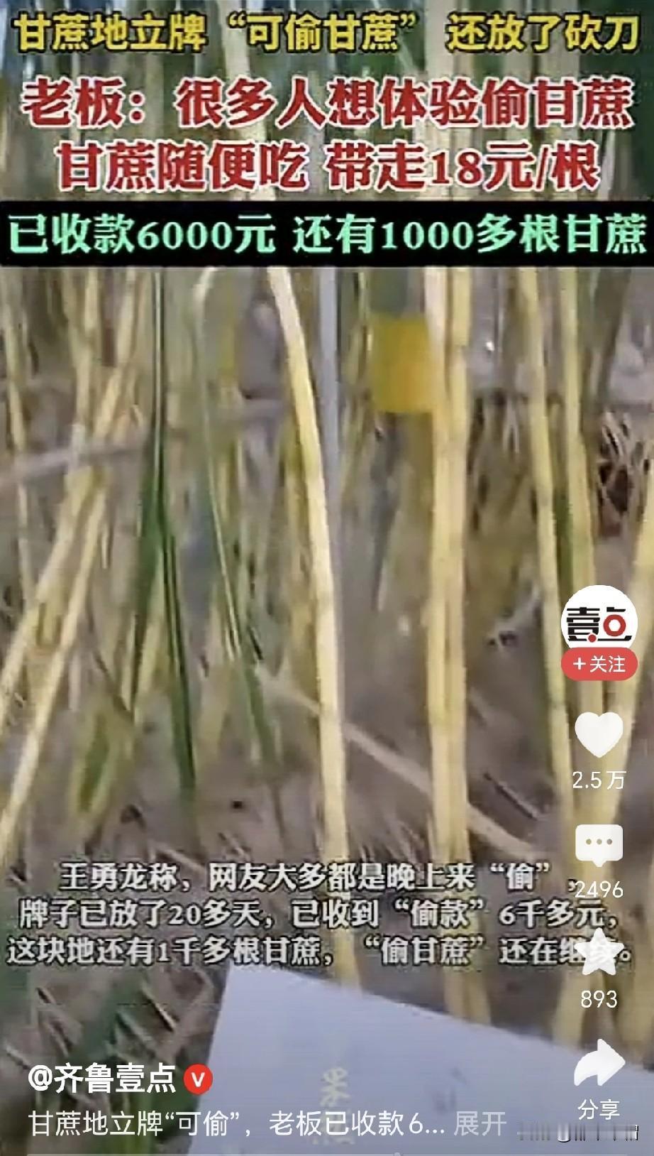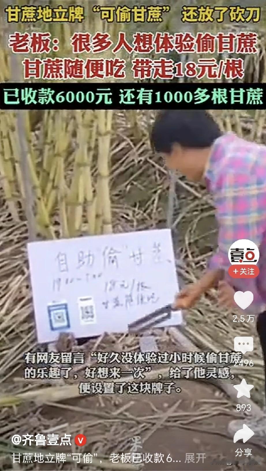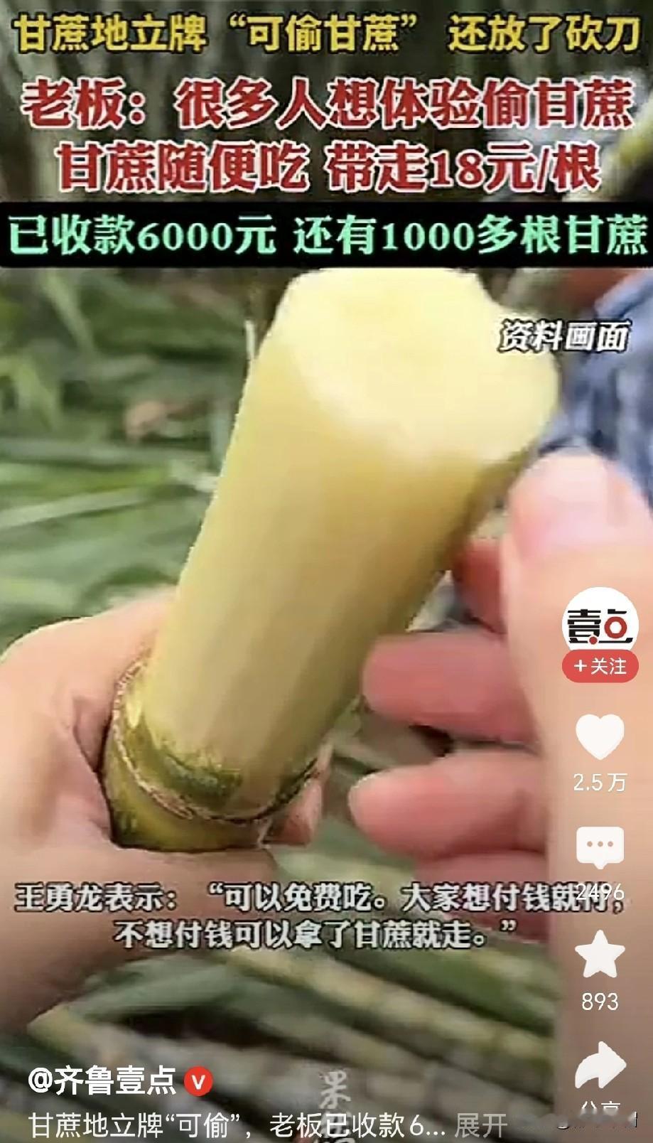 偷甘蔗吃是不是更甜?近日,杭州王勇龙甘蔗地的甘蔗成熟了,他发布了一段推介视频,视频里有一大片长势喜人的甘蔗,还有一块牌子,写着“自助偷甘蔗”。牌子旁边还放着砍刀。声明甘蔗随便吃,带走18元/根。牌子上有微信和支付宝收款码。 视频发布后,立即引来不少“小偷”,他们往往在晚上“作案”,甘蔗水分十足,小偷们一个个吃得津津有味。牌子立了二十多天,甘蔗连吃带拿被“偷”了不少。但是王勇龙也收到了6000多元“偷款”。到目前为止,甘蔗地里还有一千多根甘蔗,等着小偷们光顾。 王勇龙说:这个创意来自一位网友。这位网友曾在一个帖子后留言:“好久没有体验过小时候偷甘蔗的乐趣了,好想来一次。”虽然偷吃甘蔗不是什么光彩的事,但是对于一些人的童年来说,确是其乐无穷的事情。 绝大多数人在体验了偷甘蔗的感觉后,还是按牌子上的价格,或者市场上的价格付款了。他们要的只是那种偷偷摸摸的感觉,不是为了占便宜。当然,也难以避免有些人又吃又拿一分钱都不付。不过相信这样的人毕竟只有少数。一般人都能将心比心,体谅到种甘蔗人的辛苦。 物质生活提高了,小偷越来越少,社会风气越来越好,人与人之间更能相互理解和包容,这正是我们喜闻乐见的好景象。今天衣食无忧的你,是不是也在怀念小时候“偷甘蔗”的乐趣呢?如果是,赶快行动起来吧,到王勇龙的甘蔗地去体验一把偷甘蔗的乐趣。不过不要忘了付偷款哦,毕竟谁都不容易。