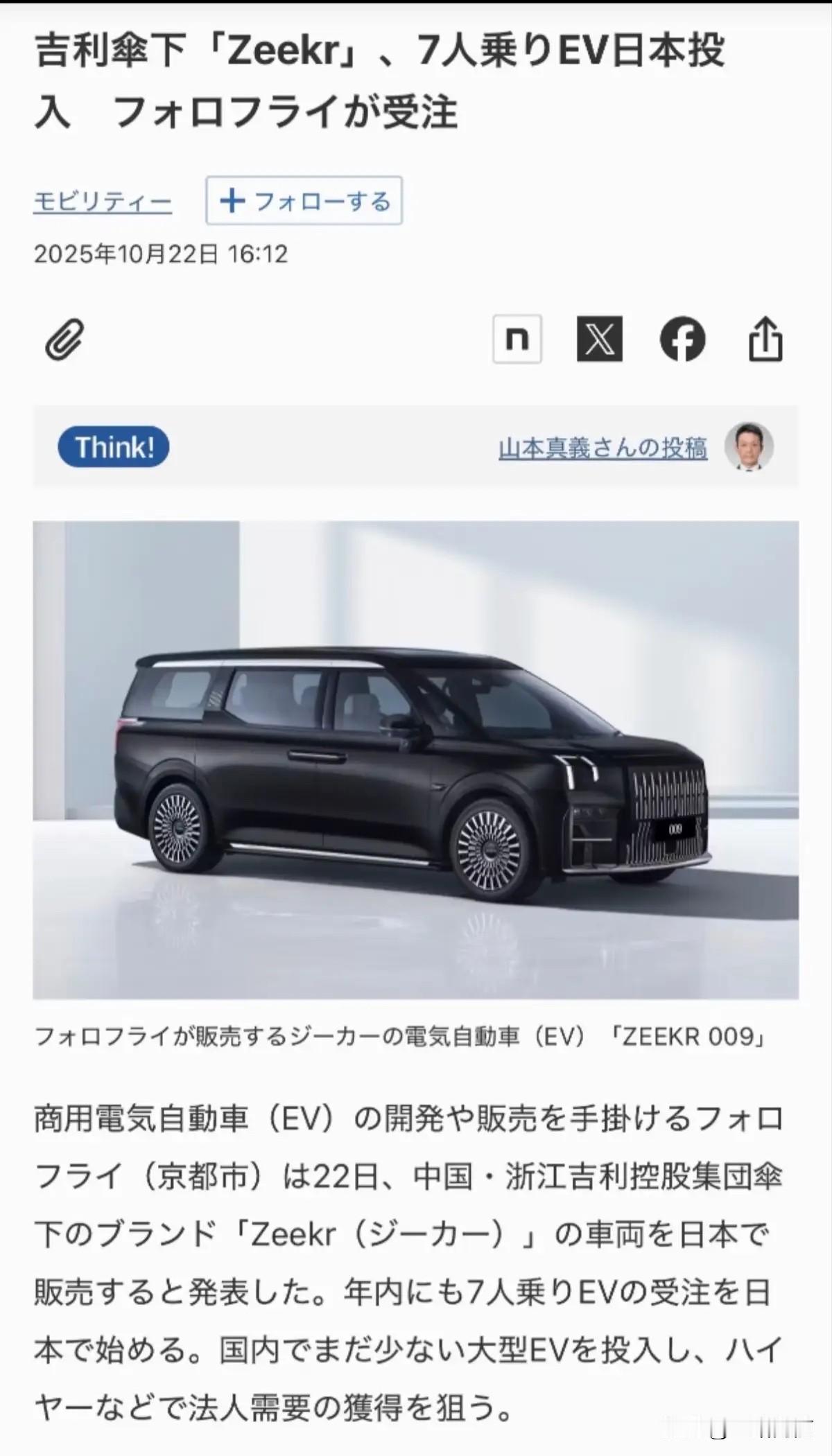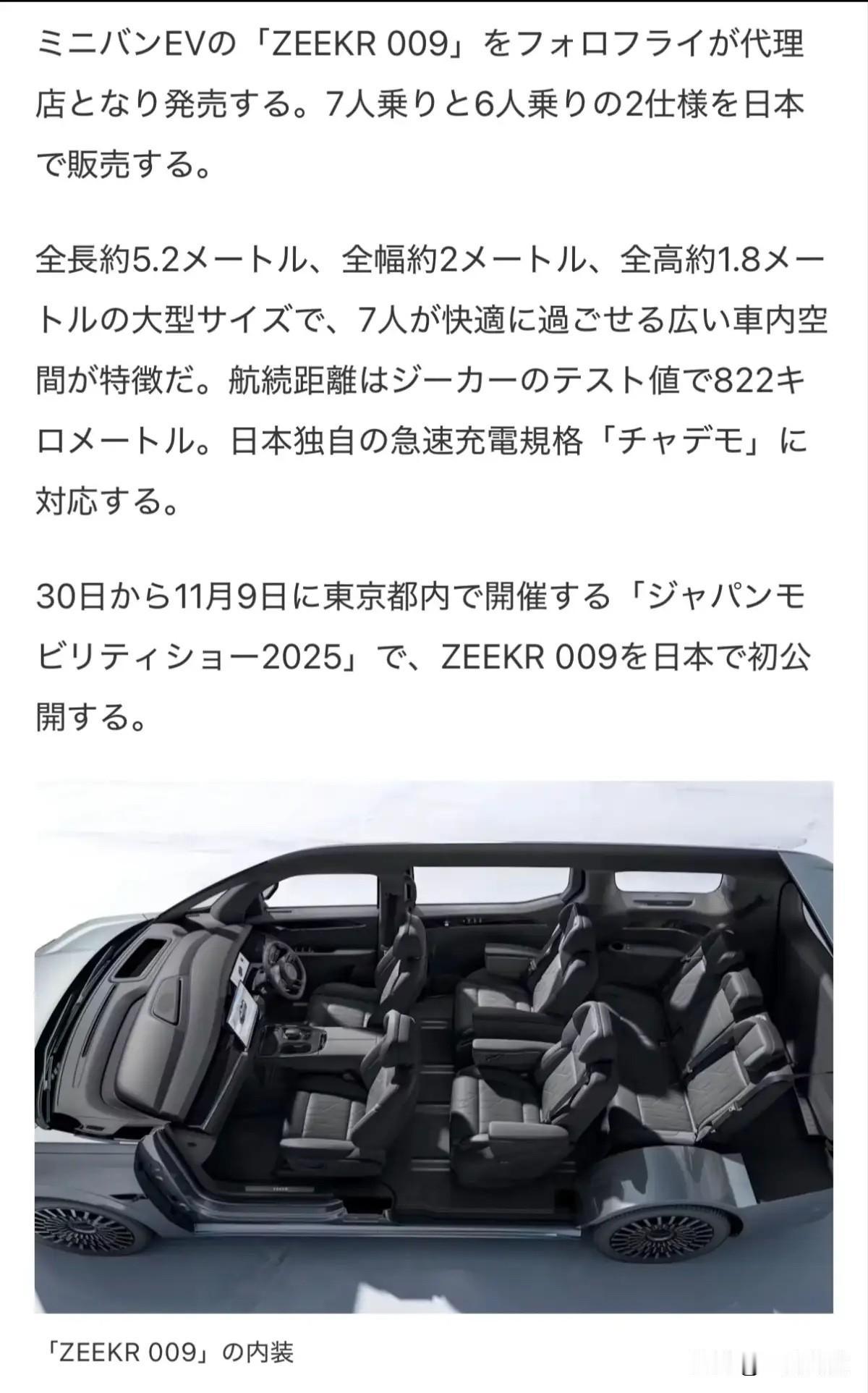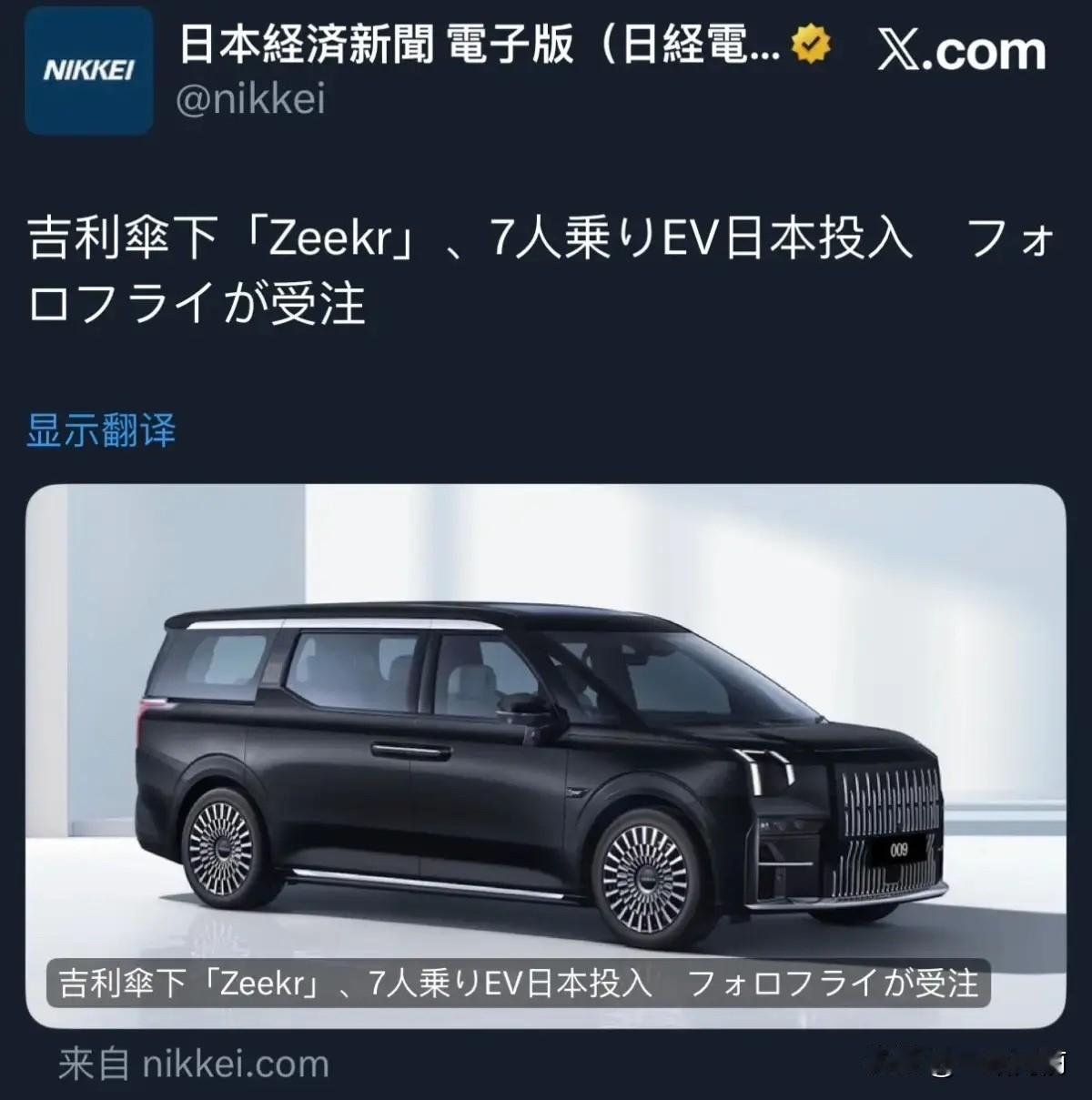 李书福的策略真不错 极氪009杀进日本,贵9万还想干翻埃尔法? 在香港市场已经连续3个月稳坐豪华MPV销量冠军,把曾经的“加价神车”丰田埃尔法按在地上打。更狠的是,2024年它直接拿下40万以上豪华MPV和纯电全品类双冠军,国内市场每卖两台四座超豪华车,就有一台是极氪009光辉版,这统治力简直没谁了。 现在这台“公路坦氪”又把战场拉到了日本,定价1105万日元(折合人民币53.5万),比国内足足贵了9.6万。要知道日本可是丰田的主场,埃尔法在那儿就是豪华MPV的“图腾”,极氪敢这么定价,到底哪儿来的底气? 拆开配置看才发现,这根本不是“碰瓷”,是真有硬实力。性能上直接碾压:双电机四驱爆发出788马力,0-100km/h加速只要3.9秒,这速度对MPV来说就是“飞毛腿”级别。续航更是戳中痛点,搭载140度麒麟电池的版本能跑900公里,就算选5C快充版,充电10分钟也能补500公里续航,彻底告别里程焦虑。 豪华感上也没输过。后排两张NAPPA真皮航空座椅能18向调节,还带按摩、通风,躺下就是“伊姆斯躺椅模式”。43英寸双层OLED大屏、30个扬声器的雅马哈音响,再加上恒温冰箱,这配置比埃尔法的“毛坯豪华”实在多了。更别说它的“720度安全盔甲”,安全数据库规模是行业平均的5倍,撞测试验里稳得一批。 不过话说回来,在日本想干翻埃尔法没那么容易。毕竟丰田深耕本土几十年,维修网点多、保值率高,老一辈消费者认这个牌子。而且日本家庭更爱小型车,豪华MPV本身就是小众市场,极氪作为外来者,品牌认知度还得慢慢攒。 但也不是没机会。现在日本年轻人越来越认新能源车,极氪的智能化优势太吸睛——双8295芯片+AI大模型,语音助手反应比 Siri 还快,还能直接用腾讯会议开移动办公会,这正是年轻商务人士想要的。之前在香港上市10天就订出6000台,说明只要产品力够硬,“外来和尚”也能念好经。 李书福这步棋其实看得很远:先在国内和香港打透市场,再带着成熟产品冲日本,不是为了短期卖爆,而是要打破“日系MPV不可战胜”的神话。就像极氪009光辉典藏版卖到89.9万,本质就是用高端产品拉升品牌高度,现在去日本也是一个道理。 其实不管能不能马上碾压埃尔法,这事儿都够提气的。以前都是日系车在中国卖高价,现在咱们的国产车能带着硬实力去人家主场“叫板”,这就是中国汽车的底气。