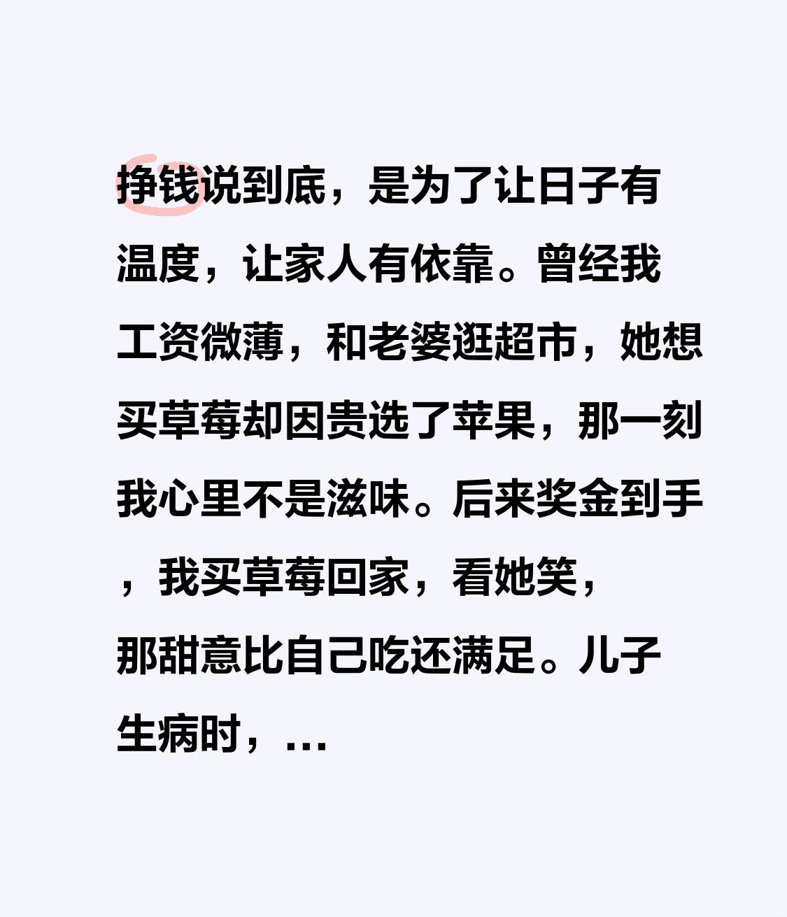 挣钱说到底,是为了让日子有温度,让家人有依靠。 曾经我工资微薄,和老婆逛超市,她想买草莓却因贵选了苹果,那一刻我心里不是滋味。后来奖金到手,我买草莓回家,看她笑,那甜意比自己吃还满足。儿子生病时,面对缴费单我攥紧了手,怕钱花了房租没着落。从那以后我拼命多接活,给全家上了保险。 钱不是虚荣的堆砌,是家人难时的底气,是选择的“缓冲带”。它能让父母就医不愁,让孩子兴趣得偿,让自己有勇气追寻自由,把日子过成想要的模样。