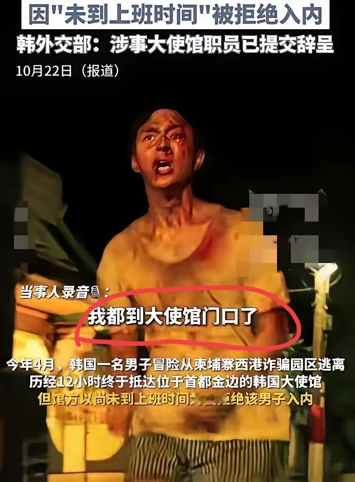 使馆门口的2小时,比电诈园区还绝望!韩国男子九死一生逃出,却被“没上班”拒之门外! 谁能想到,从柬埔寨电诈窝点徒步12小时、浑身是伤的韩国男子,以为跑到本国大使馆就捡回一条命。 结果凌晨6点的使馆门口,只等来一句“没到上班时间”,连进停车场躲躲的哀求都被拒绝。 他在恐惧里熬了2小时,生怕被诈骗团伙抓回去,那种叫天天不应的绝望,比在园区里更刺骨。 大使馆本是海外公民的最后靠山,却成了机械守规矩的“冷漠壁垒”。规定是死的,人是活的,在人命关天的时刻,僵硬的流程早该为生命让步。