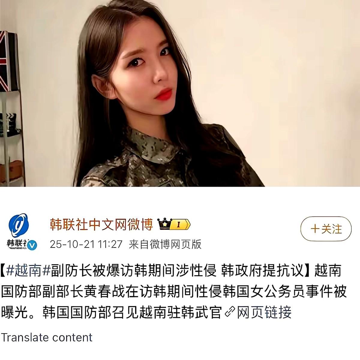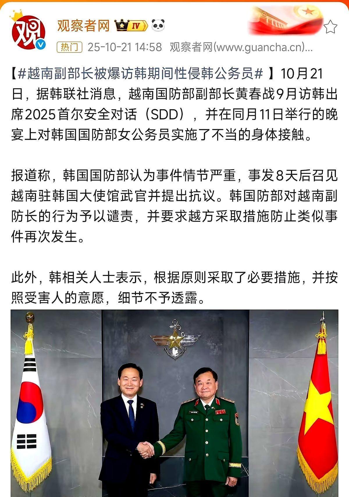 韩方召见越南武官了。 不是吵架,是憋着火,说你们那领导,摸了我们的人。 你搁这儿演哪出?副部级干部出访,前呼后拥,警卫三道,侍应六人,宴会厅亮得跟靶场似的你当是自家炕头?摸一下能摸出花来? 我当年在酒泉见过老一辈搞两弹一星的,蹲在戈壁滩啃窝头,连水都省着喝,生怕多浪费一滴。现在倒好,人家是来谈国防合作的,不是来谈桃色合作的。 韩国说按受害人意愿,细节不透露。 你信吗? 我信。 不是因为温柔,是因为他们知道这种事,说不清。 越南那边, silence。 一个字没有。 不道歉,不否认,不解释。 你懂那种感觉吗?就是你家娃闯了祸,你不上门,也不回电话,就当没这回事。 可这哪是娃闯祸?这是拿国家脸面当擦桌布。 有人说,女公务员认错人了。 哈!认错?你当是食堂打菜,手抖了?还是俩老头儿穿同款西装,连皱纹都对得上? 黄春战那张脸,网上一搜,六十几了,一脸风霜,连个帅字都沾不上边儿。 认错?你当韩国女兵是喝多了认爹? 不是一次,是137次我呸,那叫一次就够炸了。 我猜下一步,越南会说我们高度重视,已启动内部调查。 翻译过来就是关我屁事。 最可笑的是,韩国国防部拖了八天才召见。 为啥?怕闹大?怕影响印太安全对话? 你当人家是来开联谊会的? 这事儿,不是个人失德。 是制度的癌。 是我们那代人拼了命搞举国体制防卡脖子,结果现在有人把国家形象当成了洗脚城的VIP卡。 不是我不明白,这世界变化快。 可变到连脸都不要了,那还谈啥国防? 你要是真在乎安全对话, 就先把自家的人管好。 不是武器,是人。 是人。 是人。 (手机没电了。明天再骂。)