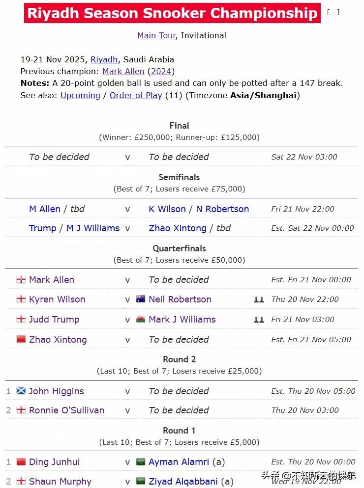 这就是是沙特土豪赛:"利雅得赛季斯诺克赛开战!顶尖选手云集,黄金球规则吸睛,丁俊晖等名将逐鹿,奖金丰厚,精彩对决不容错过!" 其实赵心童更应该关注,因为世锦赛冠军作为二号种子,8强才是开始,只要参赛就能获得5万英镑,下面让我看一下具体情况。 利亚德斯诺克锦标赛将于2025年11月19日至21日在沙特首都Boulevard City举行。作为沙特土豪举办的邀请赛,以奖金丰厚而闻名!其中,冠军奖金25万英镑、亚军12.5万英镑、4强7.5万英镑、8强5万英镑、10强2.5万英镑,参与奖5000英镑,另设独特的167分金球奖100万美元。 看到了没,轻松惬意这才是土豪赛的宗旨,最低2万5千英镑,当然你要争气,这就是为丁俊晖、肖恩墨菲量身定制的。 谁会和钱过不去,即使拥有商业帝国的丁俊晖以及商业宠儿的赵心童都没办法拒绝,那就看看赛程如何。 第一轮: 11月19日22:00,肖恩·墨菲Vs齐亚德·阿尔卡巴尼; 11月20日00:00,丁俊晖Vs艾曼·阿拉姆里。 第二轮: 11月20日03:00,罗尼·奥沙利文Vs待定; 11月20日05:00,约翰·希金斯Vs待定。 第三轮: 11月20日22:00,凯伦·威尔逊Vs尼尔·罗伯逊; 11月21日00:00,马克·艾伦Vs待定; 11月21日03:00,贾德·特鲁姆普Vs马克·威廉姆斯; 11月21日05:00,赵心童Vs待定。 别说你不羡慕,你问问斯诺克职业选手,这比赛谁不想参与,可惜土豪也不是撒钱,热门选手才是人家盘中的菜。