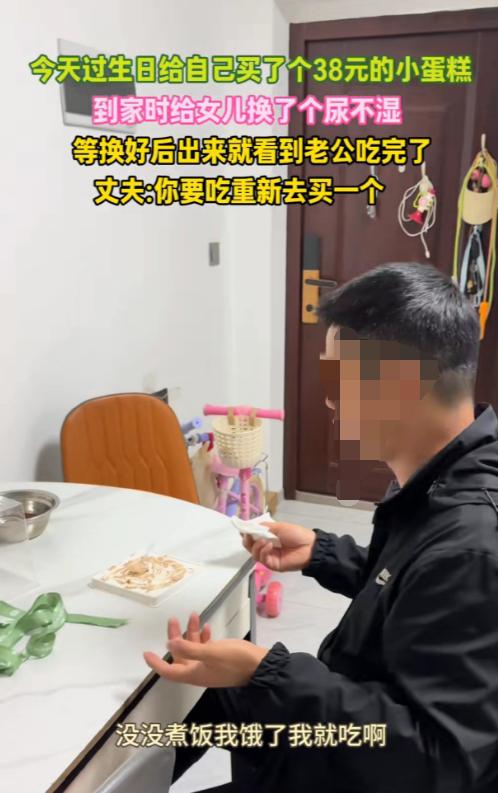 女子过生日给自己买了个38元的小蛋糕,结果到家时先给女儿换了尿不湿,再出来丈夫已经全都吃完了,还说:没煮饭我饿了就吃了。 这种男人真的不会心疼人,还有点自私! 以没煮饭饥饿为借口,掩盖自己自私吃蛋糕的行为,自己老婆生日有心的人早就做好饭或买好礼物了,还在家等着老婆回家做饭?! 这种男人就是自私自利,没教养,自以为是的人,爱是相互的,吃东西总要问一下家里其他人吃了没有,吃一部分留点给别人,这是最起码的礼貌吧,这种男人就是没家教! 这男人1:无能,媳妇生日只能买小蛋糕;2:无品,吃东西一发不可收拾;3:自私,吃东西不考虑媳妇;4:无情,媳妇生日不记得! 自私!眼里只有自己,碰到这样的也只能认了,要是因为这事吵架,又要被说成矫情说:“只是一块蛋糕而已”,可有谁能明白眼里心里没有你的感受,好好爱自己吧,谁也别指望!